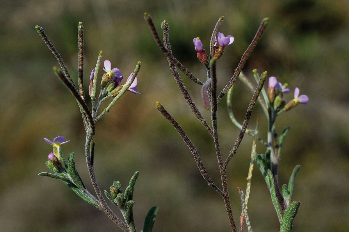 Indumento denso, blanquecino, de pelos estrellados Tallos erectos, simples o ramificados desde la base. Hojas 5–20 x 1–2 mm, alternas, sésiles, oblongas, linear–oblongas o linear–espatuladas, enteras o sinuado–dentadas, de ápice obtuso. Racimos corimbiformes, paucifloros (3–9 flores), ebracteados. Flores actinomorfas, hermafroditas, tetrámeras; sépalos 2–2,5 mm, los laterales ligeramente gibosos en la base, tomentosos, de margen membranáceo, verdosos con tintes violáceos; pétalos 3–4,5 mm, erecto–patentes, obovado–espatulados, a veces desiguales, al principio amarillentos y finalmente rosado–violáceos; estambres 6, tetradínamos. Frutos en silicua, de 5–25 x c. 1 mm, lineares, de sección circular, erecto–patentes, algo torulosos, con nervio medio prominente y septo con dos bandas longitudinales pardas. Semillas uniseriadas