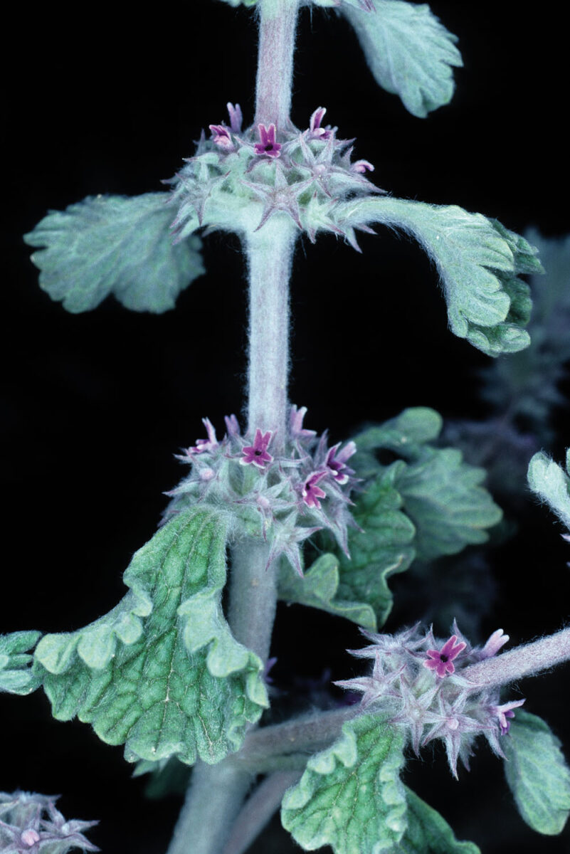 Tallo blanquecino, lanoso. Hojas 10–40 x 10–40 mm, con pecíolo de 10–35 mm, ovadas o suborbiculares, cordadas, crenadas, tomentosas. Inflorescencia en verticilastros globosos, densos. Bractéolas subuladas, pelosas. Cáliz con tubo de 5–7 mm, con 10 nervios y 5 dientes subiguales, erectos o erecto–patentes, lineares, subulados. Corola bilabiada, crema o púrpura; tubo 4–6 mm, labio superior recto, ± plano, bífido, el inferior trilobulado. Núculas trígonas