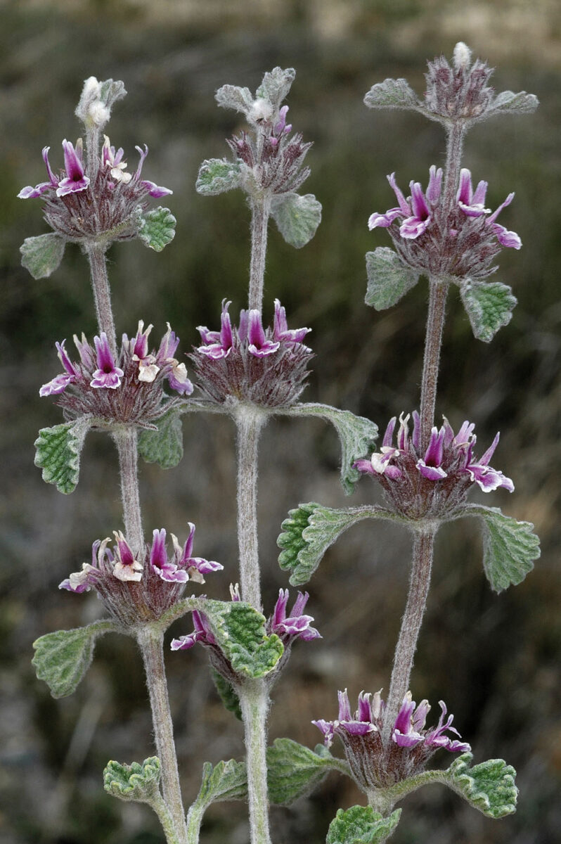 Tallo blanquecino, lanoso. Hojas 15–40 x 10–40 mm, flabeliformes, cuneadas, dentadas o lobuladas, tomentosas. Inflorescencia en verticilastros densos, a veces espiciforme. Bractéolas muy pequeñas o ausentes. Cáliz con tubo < 5 mm y 5 dientes patentes en la fructificación, triangular–lanceolados, casi espinescentes. Corola 4–6 mm, bilabiada, crema o púrpura; labio superior recto, ± plano, bífido, erecto, el inferior trilobulado con lóbulo central orbicular. Núculas elípticas, pelosas