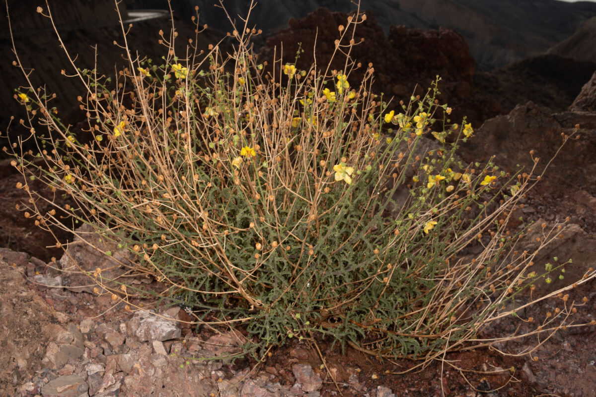 Pubescente-glandulosas. Hojas basales pecioladas, de hasta 12 x 8 cm, oblongas, lirado-pinnatisectas o sinuadas, con divisiones irregularmente dentadas; las superiores sentadas, ovadas, semiamplexicaules, gruesa e irregularmente bidentadas. Inflorescencia simple o con algunas ramas en la base, laxa, con flores solitarias. Brácteas medias y superiores más cortas que el cáliz, ovadas, dentadas. Flores con pedicelos de menos de 5 mm. Cáliz de 13-15 mm, con lóbulos ovado-rómbicos, marcadamente dentados. Corola de 35-55 mm de diámetro, amarilla, con 2 manchas violado-oscuras en la base de los lóbulos superiores. Androceo con 4 estambres; los 2 superiores densamente cubiertos de pelos amarillentos y violáceos; los 2 inferiores más largos, con anteras largamente decurrentes, glabros, excepto en la base. Cápsula de c. 10 mm, ovoidea, laxamente pubescente