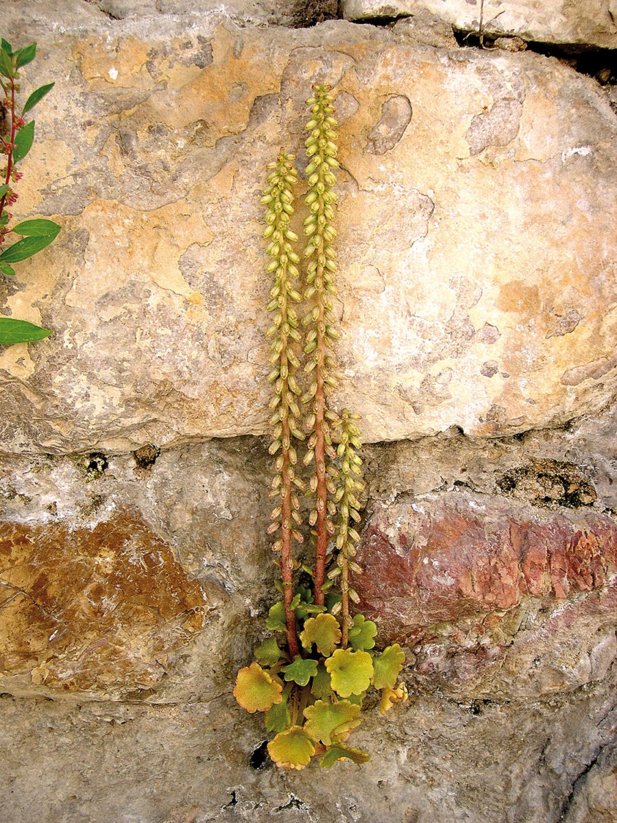 Herbácea, glabra, con cepa tuberosa. Tallo generalmente simple. Hojas alternas, carnosas, las basales peltadas, con pecíolo central y lámina suborbicular, festoneada. Inflorescencia racemosa, terminal, que ocupa el 60–90 % de la longitud del tallo; brácteas más largas que los pedicelos. Flores actinomorfas, hermafroditas, pentámeras, péndulas. Sépalos 1–2 mm, soldados en la base, subagudos. Corola 5–8 mm, tubular o subcampanulada, poco o nada estrechada en la garganta, de color pajizo o verdoso claro, rematada en 5 lóbulos de 1–2 mm, tan largos como anchos. Estambres 10, soldados al tubo de la corola, inclusos. Carpelos 5, libres. Fruto polifolículo; semillas 0,5–0,7 mm, pardo–oscuras