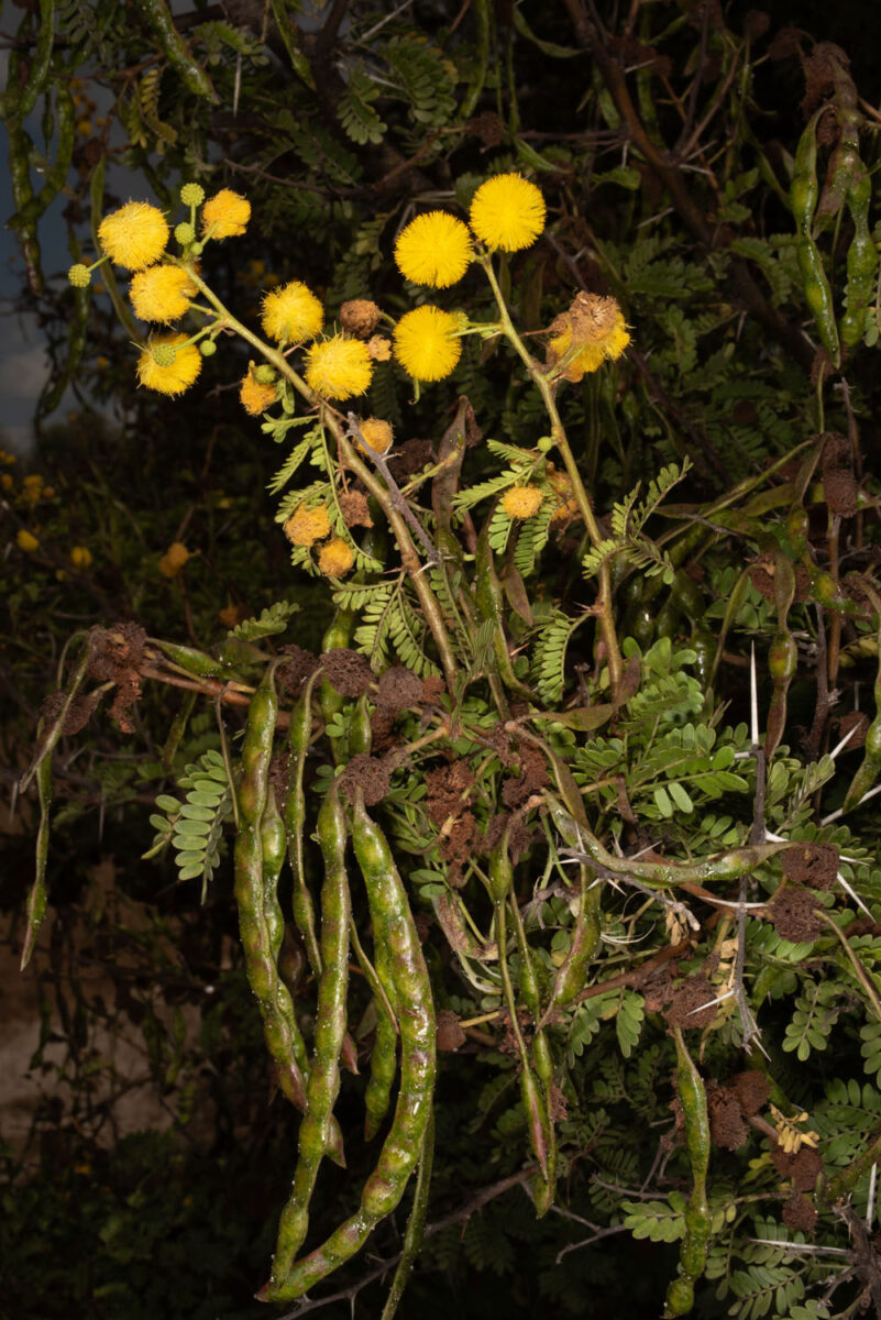 Espinosa, caducifolia. Hojas bipinnadas; estípulas espinosas, algo curvadas, de hasta 11(24) cm; pecíolo y raquis generalmente con glándulas; folíolos de ápice redondeado o subagudo. Inflorescencias en glomérulo globoso de 1,5–1,8 cm de diámetro, pedunculadas, solitarias, axilares; conflorescencias racemiformes, terminales. Flores actinomorfas, pentá meras, de color amarillo dorado. Cáliz 1,3–2 mm, campanulado. Corola 2,5–3 mm. Estambres muy exertos. Ovario glabro. Legumbre 6–17 x 0,6–1 cm, ± comprimida, torulosa, falciforme, ± contraída entre las semillas. Semillas parduscas o verdosas
