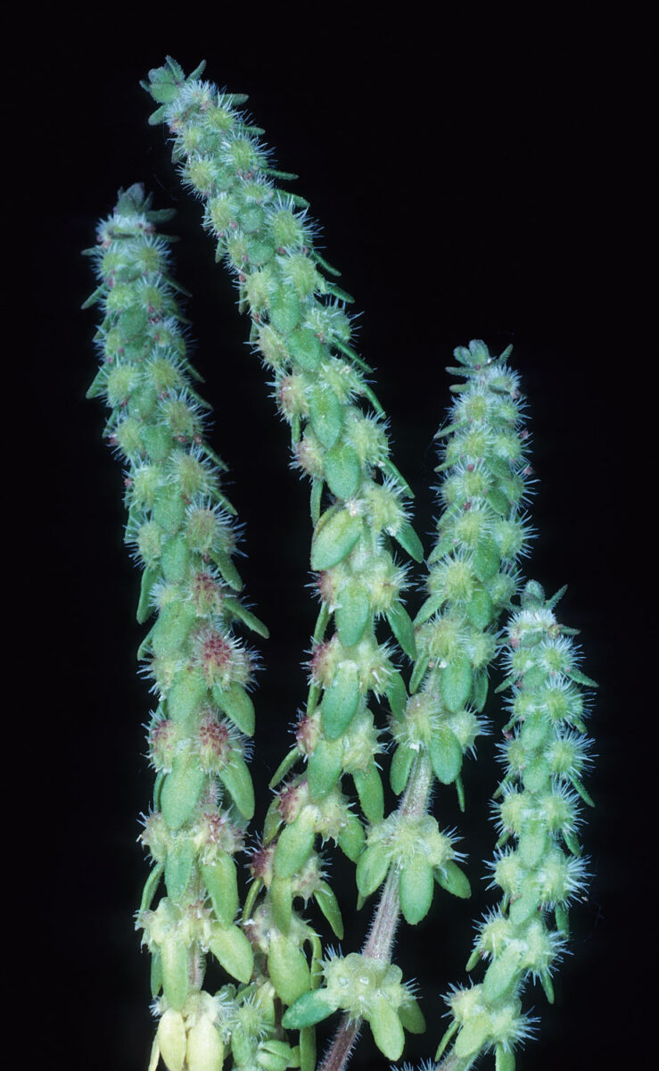 Tallos glabros en la porción foliosa, muy densamente setoso–híspidos en la zona florífera. Hojas (0,5)1–12(15) mm, en verticilos de 4, de elípticas a obovadas, obtusas, glabras. Brácteas similares a las hojas, pero antrorso–aculeoladas. Inflorescencias en cimas axilares trifloras, 4 por cada nudo. Flores actinomorfas, hermafroditas y unisexuales, las laterales de cada cima trímeras, masculinas, la central tetrámera, hermafrodita; cáliz nulo; corola 1–1,5 mm de diámetro, con lóbulos ovados, obtusos, amarillo–verdosa, a veces teñida de púrpura; estambres 3–4. Cuerpo fructífero (2)3–4,5(6) mm, hemisférico, blanco–amarillento o pardusco, glabro al principio y puberulento en la madurez, con abundantes acúleos hialinos muy rígidos, generalmente rectos; borde inferior fimbriado, con pelos de 0,2–0,4 mm. Mericarpos (0,9)1,1–1,2 x 0,7–0,8 mm, en general 2 por flor, reniformes o hemisféricos, lisos, papilosos, marrón oscuros o negruzcos