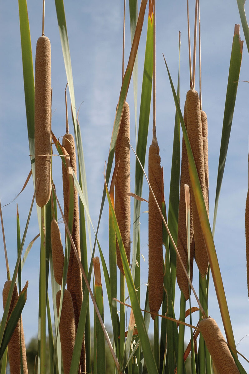 Rizomatosa, monoica, con tallos erectos, simples. Hojas (3)5–9(14) mm de anchura, alternas, dísticas, ensiformes, de sección semicircular; las superiores con vainas atenuadas o ligeramente auriculadas. Inflorescencia en espádice cilíndrico, terminal, formada por dos partes espiciformes muy densas, la superior masculina y la inferior femenina, separadas por una porción de eje desnudo de 0,6–3(5) cm; la femenina (12)14–27(60) x (0,8)1,2–2 cm; la masculina (13)16–27(50) cm. Flores masculinas con 3 estambres y bractéolas generalmente laciniadas; las femeninas de estigma linear, rodeadas de bractéolas obovado–apiculadas (frecuentemente infladas), translúcidas, pardo claras o amarillentas. Fruto en aquenio estipitado, con pelos dispuestos en la base