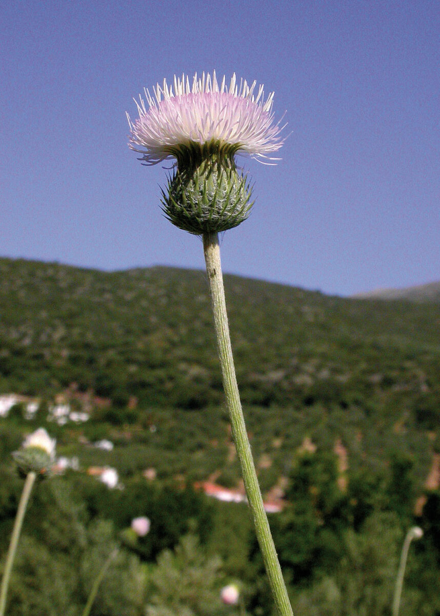 Anual o perennizante, araneosa. Tallos erectos, con ramificación ahorquillada, alado–espinosos en la mitad inferior. Hojas alternas, obovado–espatuladas u oblongo–elípticas, pinnatífidas, manchadas de blanco, de lóbulos palmeado–espinosos. Capítulos discoides, terminales, solitarios; pedúnculos de hasta 20(30) cm; involucro 10–18 mm de anchura, ovoideo o campanulado, ± flocoso–araneoso, con varias filas de brácteas, las medias ovado–lanceoladas, adpresas, acuminadas, con espina terminal de hasta 4 mm. Flores flosculosas, hermafroditas, las externas a menudo estériles, rosadas o raramente blancas; estambres con filamentos soldados en tubo. Aquenios 4–5 mm, oblongo–obovoideos, tetrágonos, con 4 fosetas longitudinales alternando con 4 costillas y una corona apical; vilano 12–15 mm, caedizo, de varias filas de pelos escabriúsculos, soldados en anillo basal