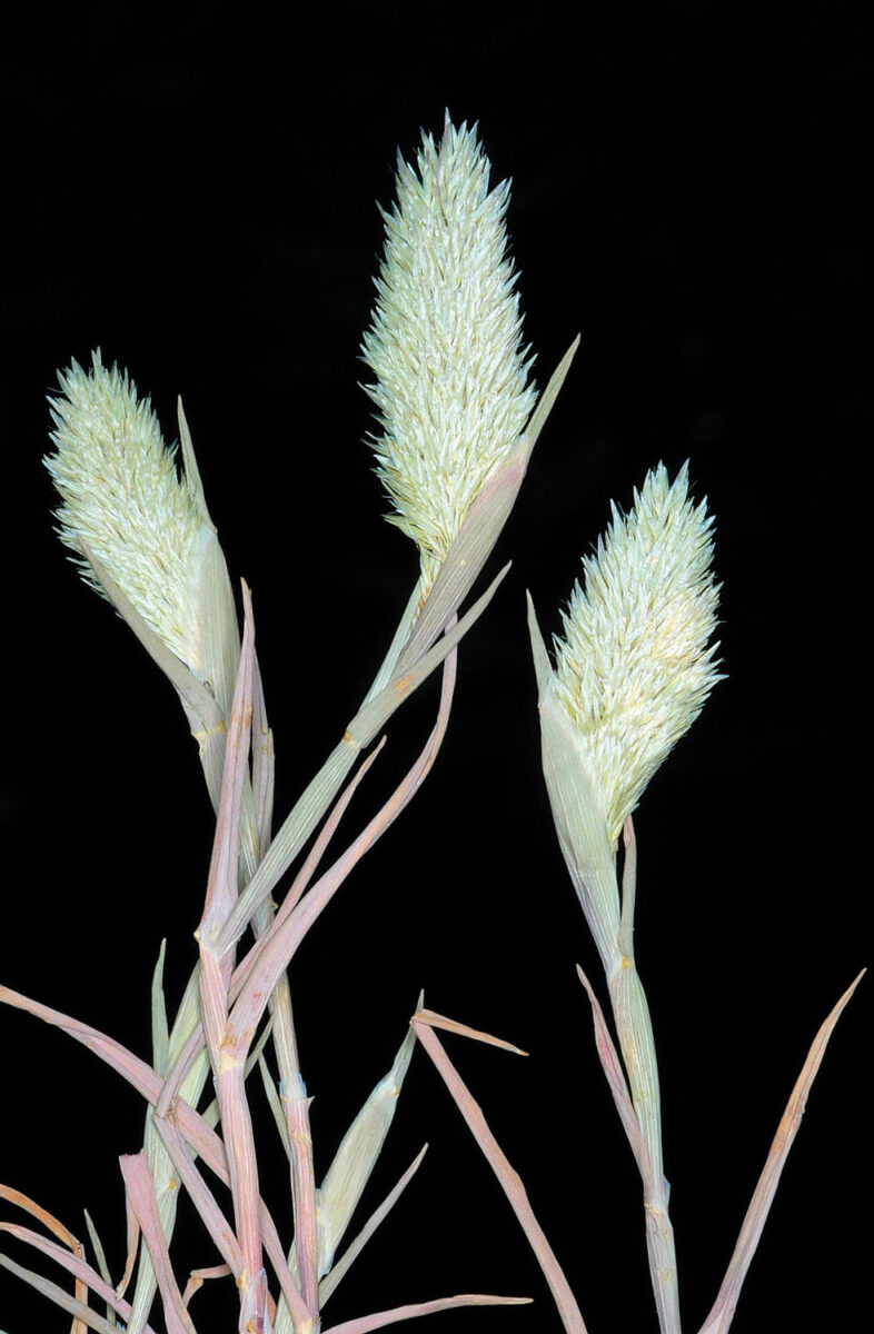 Tallos acodados en la base. Vaina de la hoja superior muy dilatada; lámina de las hojas 1–4 cm x 2–3 mm, patente, a veces falcada, plana o conduplicada; lígula 1,5–3 mm. Panícula 2–5 cm, muy contraida y densa, a veces parcialmente incluida en la vaina de la hoja superior. Espiguillas 3,5–4,5 mm, unifloras; glumas ligeramente infladas en la parte inferior, estrechamente lanceoladas, muy agudas, la inferior 3–3,5 mm, la superior 3,5–4,5 mm; callo peloso; lema 1,3–1,5 mm, peloso, de ápice obtuso o truncado con 2 sétulas de 1–1,3 mm y arista de 3–4(5) mm inserta en el tercio inferior. Anteras 0,5–0,7 mm