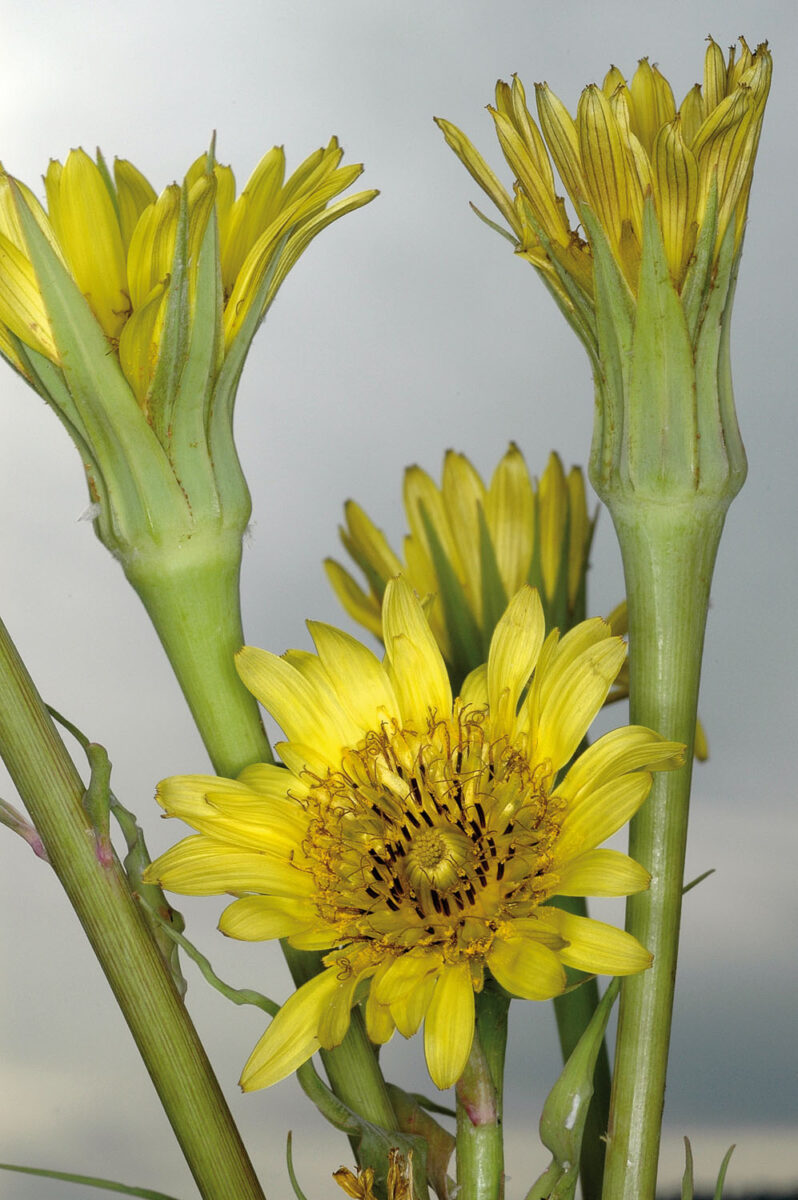 Tallos solitarios, simples, bifurcados o ramificados desde la base, glabrescentes, verdosos, con algunas manchas rojizas. Hojas basales numerosas, lineares o linear–lanceoladas, de margen liso, semiamplexicaules, flocoso–lanuginosas en la axila; las caulinares 10–25(30) x 1–1,5(2) cm, las superiores más cortas, ensanchadas en la base, alternas. Capítulos homógamos, terminales, solitarios; pedúnculos cilíndricos, marcadamente engrosados en la antesis; involucro con una fila de brácteas; brácteas (7)8–12(14), de 29–45 x 4–7 mm en la antesis, lanceoladas, glabras. Lígulas 16–30 mm, de longitud de 2/3–1/2 de la de las brácteas, de color amarillo pálido. Aquenios 23–34 mm, rectos o ligeramente curvados, muy escábridos, atenuados en un pico de 11–22 mm, de ápice claviforme. Vilano 18–27 mm, plumoso