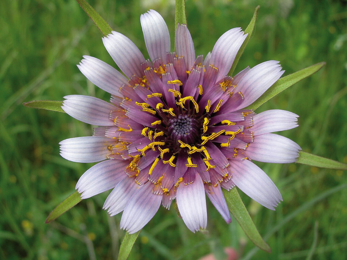 Tallos simples o ramificados desde la mitad superior, glabrescentes. Hojas basales numerosas, lineares o linear–lanceoladas de margen liso o undulado, semiamplexicaules, flocoso–lanuginosas en la base; las caulinares 8–20(25) x 1–2(3) cm, ensanchadas en la base, alternas. Capítulos homógamos, terminales, solitarios; pedúnculos marcadamente engrosados en la antesis; involucro con una fila de brácteas; brácteas 8(12), de 30–40(45) x 4–7 mm en la antesis, lanceoladas, glabras. Lígulas 15–23 mm, de longitud c. 1/2 de la de las brácteas, violáceo–purpúreas, amarillentas en la base y en los dientes. Aquenios 35–45(50) mm, rectos, escábridos, atenuados en un pico de 14–24 mm, subcilíndrico. Vilano 25–35 mm, plumoso