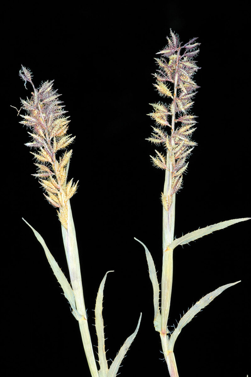 Hojas de vaina dilatada; lámina hasta 5 cm x c. 2 mm, plana o conduplicada; lígula pelosa. Espiga 4–10 cm, semejando una panícula, compuesta de grupos de 4–5 espiguillas y a veces envuelta por la vaina de la hoja superior. Espiguillas 4–5 mm, unifloras, sésiles, comprimidas dorsalmente; glumas desiguales, la inferior 0,7–1 mm, membranácea, de ápice bífido, sin nervios, la superior 3–5 mm, coriácea, 7–nervada, cada nervio con una línea de aguijones uncinados; lema c. 3,5 mm, más corto que la gluma superior, trinervado, papiráceo. Anteras 0,5–0,7 mm