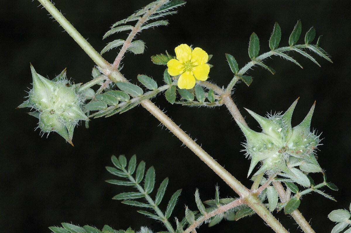 Hierba postrada, pubescente, poco ramificada. Hojas 0,7–4 cm, opuestas, paripinnadas, con 4–8 pares de folíolos, ovados o lanceolados, peciolulados, de base asimétrica; estípulas 2,5–3,5 mm, lanceoladas. Flores actinomorfas, hermafroditas, axilares, solitarias; sépalos 5, de 2,7–4,5 mm, libres, lanceolados, caducos; pétalos 5, de 4–6 mm, libres, amarillos, glabros. Estambres 10. Ovario súpero; carpelos 5. Fruto esquizocarpo, de 4–10 mm (excluidas las espinas); mericarpos 5, muy duros, con cresta verrugosa central y 4 espinas laterales, dos de ellas mucho más largas