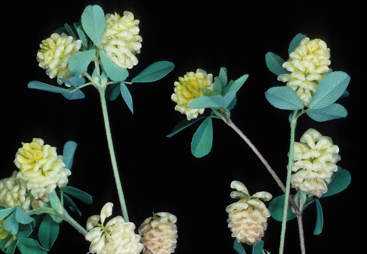 Anuales, tomentosas. Tallos erectos, ramificados o simples. Peciolos de hasta 30 mm; folíolos de 10-20 mm, obovados o elípticos, denticulados, obtusos, truncados o retusos; estípulas ovado-acuminadas. Inflorescencias de 15-22 mm de diámetro, hemisféricas en la fructificación, axilares y terminales, multifloras. Pedúnculos de hasta 40 x 0,6-0,8 mm en la fructificación, más largos que las hojas, con pelos patentes. Pedicelos tan largos o más largos que el tubo del cáliz, reflejos en la fructificación. Cáliz membranoso, con 5 nervios; dientes desiguales, los superiores ligeramente más cortos que el tubo, los inferiores de 1,5-3 veces más largos que el tubo, glabros o ciliados. Corola de (7)7,5-9 mm, bastante más Iarga que el cáliz, persistente y escariosa en la fructificación, amarilla virando a pardo en la desecación, con estandarte estriado longitudinalmente y de margen denticulado