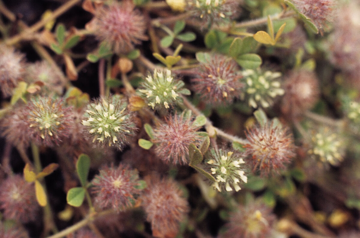 Tallos procumbentes o ascendentes, pubescentes, con pelos patentes. Hojas trifolioladas; folíolos hasta 15 x 9 mm, obovados u obcordados, truncados o emarginados, enteros, pubescentes; estípulas ovado–acuminadas, membranáceas, pubescentes, con pelos largos de base ensanchada en el envés y a veces con pelos cortos en el ápice del haz. Inflorescencias capituliformes, multifloras, terminales, sentadas e involucradas por 3 estípulas de las dos hojas superiores, obovoideas, sin bractéolas. Cáliz obcónico, pubescente, con 20–30 nervios; garganta abierta, rodeada de un anillo de pelos; dientes subiguales, lineares, pubescentes. Corola 6,5–12 mm, papilionada, blanca o rosada, glabra. Androceo diadelfo. Legumbre membranácea, con 1 semilla. Semillas lisas o acanaladas, amarillas