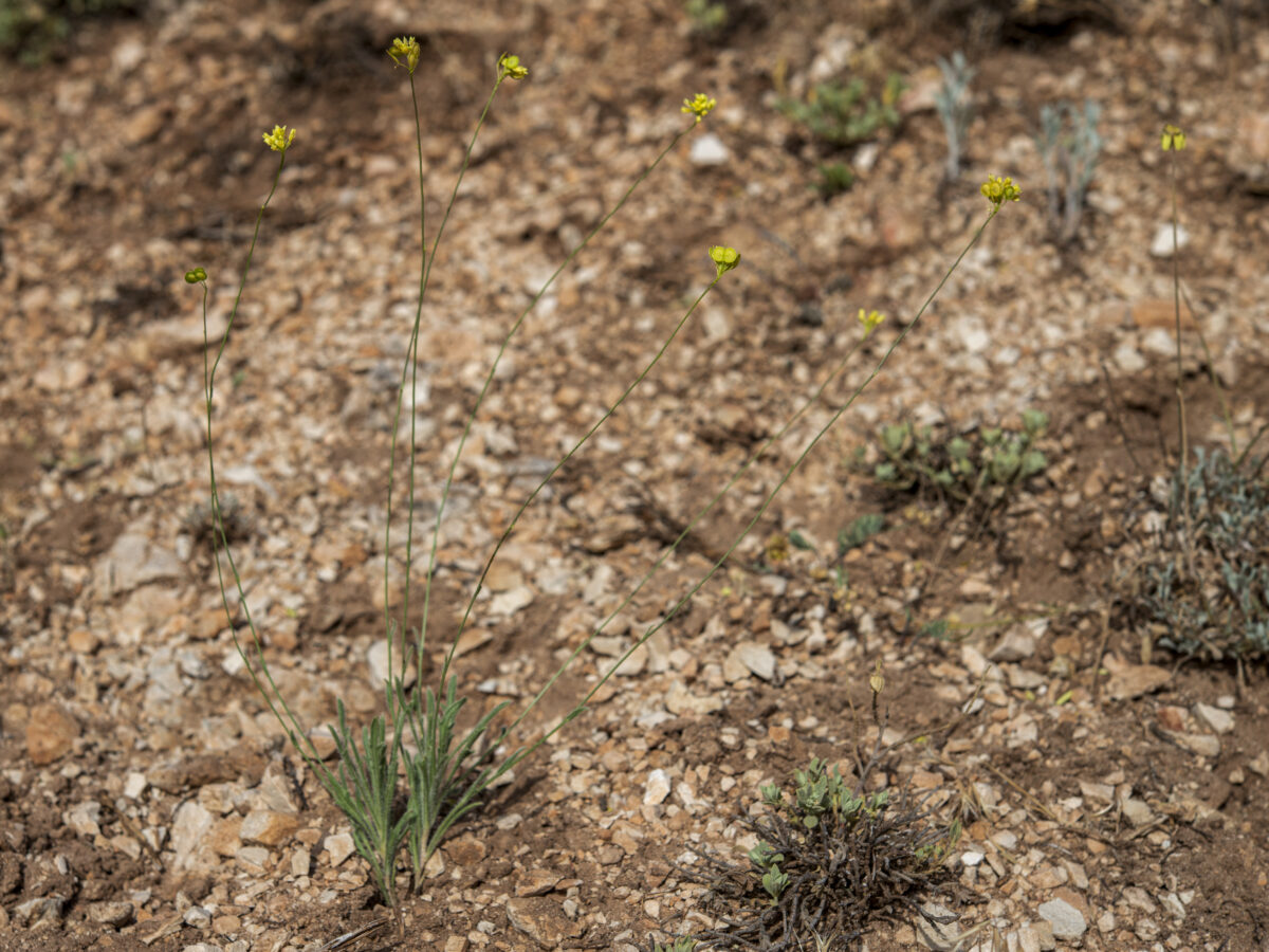 Cepa lignificada, a menudo con restos foliares. Tallos simples o con algunas ramas cortas en el tercio superior, glabros o con setas cortas en su base. Hojas 3–8 x 0,2–0,5(0,7) cm, en roseta laxa o apenas delimitada, lineares u oblanceoladas, subagudas o agudas, enteras o pinnatífidas, con 2–6 dientes profundos en su mitad apical; las caulinares 3–10, de 0,5–2 x 0,1–0,7 cm, bracteiformes o similares a las basales, lineares, sésiles o dilatadas en la base; todas setosas, de tacto áspero y punzante, con pelos rígidos de base engrosada, acompañados o no de pelos finos más cortos. Inflorescencia ebracteada, simple o poco ramosa; racimos congestos, corimboides (1–3 veces más largos que anchos), muy poco alargados en la fructificación. Flores actinomorfas, hermafroditas, tetrámeras; sépalos 1,5–3 mm, amarillentos, glabros o rara vez pelosos, apenas gibosos; pétalos 3–4,5 mm, auriculados en la base y con uña muy corta, amarillos; estambres 6, tetradínamos, con filamentos filiformes; ovario súpero, con 1 primordio por lóculo. Frutos en silícula angustisepta, de 5–6 x 9–11 mm, planos, dídimos; valvas suborbiculares o elípticas, con el margen plano y visiblemente alado, glabras o con pelos mazudos en el disco, con las semillas prominentes; pedicelos 4–8 mm, erecto–patentes, a menudo pelosos; estilo 3–4 mm