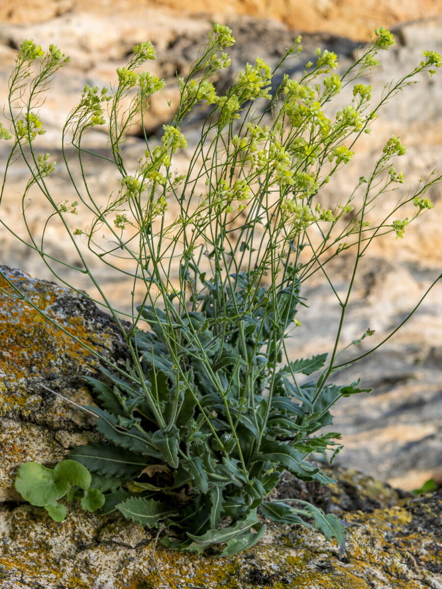 Cepa lignificada, sin apenas restos foliares. Tallos ramosos desde su mitad, laxa o densamente pelosos en la base, glabrescentes más arriba. Hojas basales (4)6–16 x 1–3,5 cm, no arrosetadas, dejando ver los entrenudos, obovadas a oblanceoladas, subagudas, sinuado–dentadas o pinnatífidas, a veces con dientes pequeños intercalados entre otros mayores, adelgazadas en un largo pecíolo; las caulinares (3–7), de 3–5 x 0,5–1,8 cm, de aspecto y tamaño similar a las basales, progresivamente más pequeñas hacia la inflorescencia, semiamplexicaules o amplexicaules; todas de color verde intenso, a menudo con tintes violáceos, glabrescentes o con pelos cortos y aterciopelados de tamaño uniforme. Inflorescencia ebracteada, laxa, con 3–4 ramas; racimos parciales alargados en la fructificación. Flores actinomorfas, hermafroditas, tetrámeras; sépalos 2–4 mm, amarillentos, glabros, apenas gibosos; pétalos (3)4–8 mm, auriculados en la base y con uña muy corta, amarillos; estambres 6, tetradínamos, con filamentos filiformes; ovario súpero, con 1 primordio por lóculo. Frutos en silícula angustisepta, de 4–9 x 8–15(17) mm, planos, dídimos; valvas suborbiculares o elípticas, con el margen plano y brevemente alado, glabras o a veces con pelos mazudos en el disco, con las semillas prominentes; pedicelos 9–12 mm, erecto–patentes, glabros o laxamente vilosos; estilo 3–4(5) mm