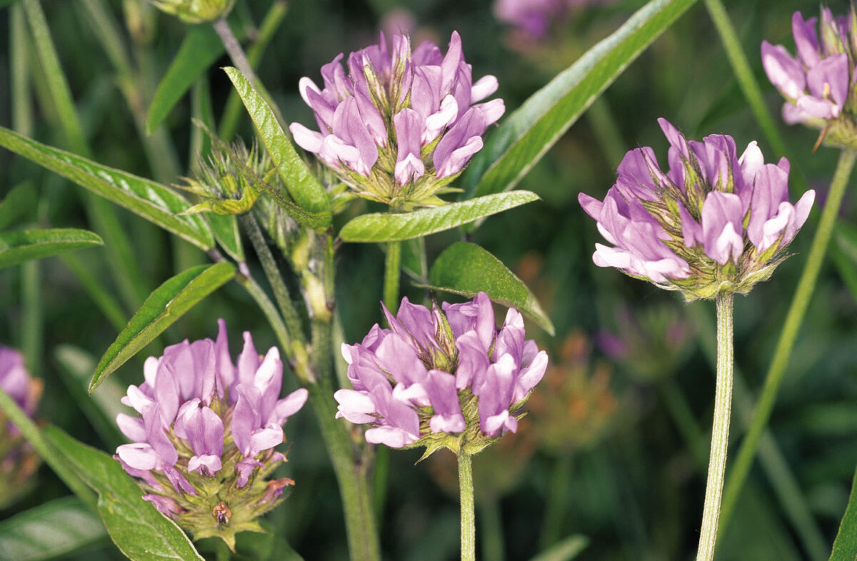 Fétida, con tallos poco ramificados, ± seríceos. Hojas hasta 12 cm, alternas, trifolioladas; estípulas lanceoladas; folíolos 15–80 x 7–25 mm, elípticos o lanceolados, con pelos ± dispersos por el haz, seríceos sobre los nervios del envés. Inflorescencias largamente pedunculadas, más largas que las hojas axilantes, globoso–capituliformes, con 14–25 flores papilionadas. Cáliz 12–16 mm, con tubo más corto que los dientes y pelos setáceos principalmente sobre los nervios. Corola azul–violeta; estandarte 13–17 x 4–6 mm; alas casi tan largas como el estandarte y quilla de menor tamaño. Estambres 10, diadelfos, ± de la misma longitud, con tubo muy desarrollado. Ovario densamente seríceo. Fruto 13–19 mm, indehiscente, monospermo, con una parte seminal ovoidea, setoso–serícea, glandulosa, y un pico 2–4 veces más largo, aplanado, recto o falcado, escábrido