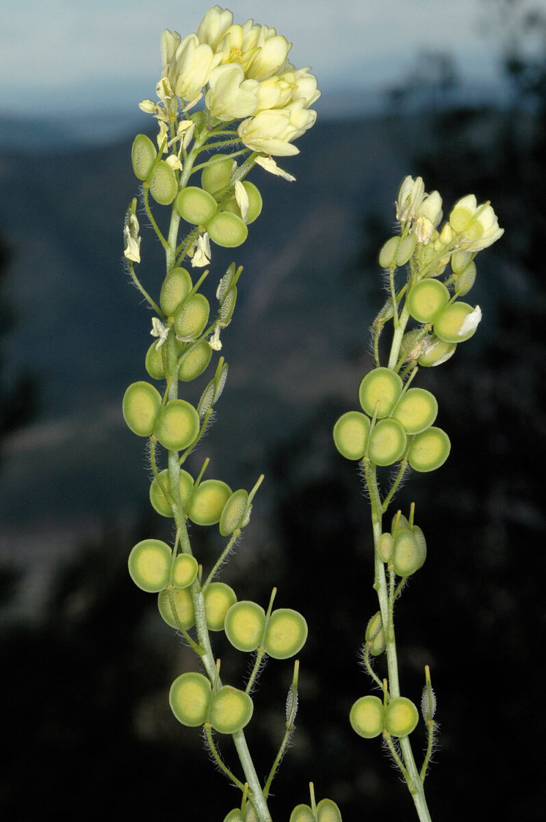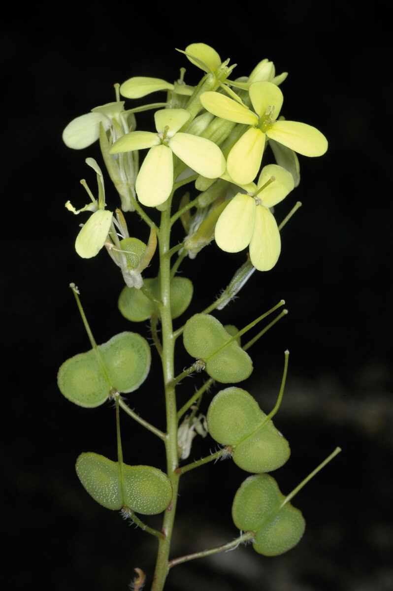 Tallos ramificados en la mitad superior, con largos pelos simples y patentes en la base, glabrescentes en la parte superior. Hojas 3–12 x 1–2(3) cm, en roseta basal delimitada y densa, de oblanceoladas a oblongo–lanceoladas, enteras o pinnatífidas; las caulinares 0,7–4 x 0,3–0,6 cm, numerosas, progresivamente menores hacia la inflorescencia, sésiles; todas hirtas, con pelos setosos laxos. Inflorescencia amplia, muy ramosa, ebracteada, con racimos densos en la fructificación. Flores actinomorfas, hermafroditas, tetrámeras; sépalos (4)6–12 mm, amarillentos, glabros, los laterales visiblemente gibosos en la base (giba 2–3 mm); pétalos 7–15 mm, atenuados en uña tan larga como el limbo, amarillos; estambres 6, tetradínamos, los internos con filamento brevemente alado en su tercio basal; ovario súpero, con 1 primordio por lóculo. Frutos en silícula angustisepta, de 6–10 x 12–18 mm, planos, dídimos; valvas de suborbiculares a anchamente ovales, glabras o con pelos mazudos en el disco, con margen de hasta 1 mm de anchura, no engrosado, hialino, concrescente o decurrente sobre la base del estilo, con las semillas prominentes; pedicelos hasta 12 mm, erecto–patentes, glabros o híspidos hacia su ápice; estilo 5–10 mm