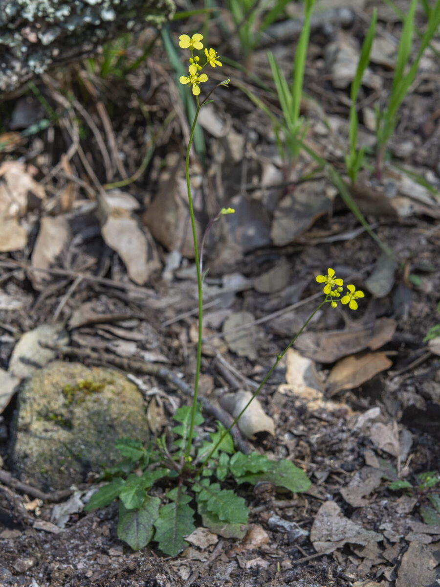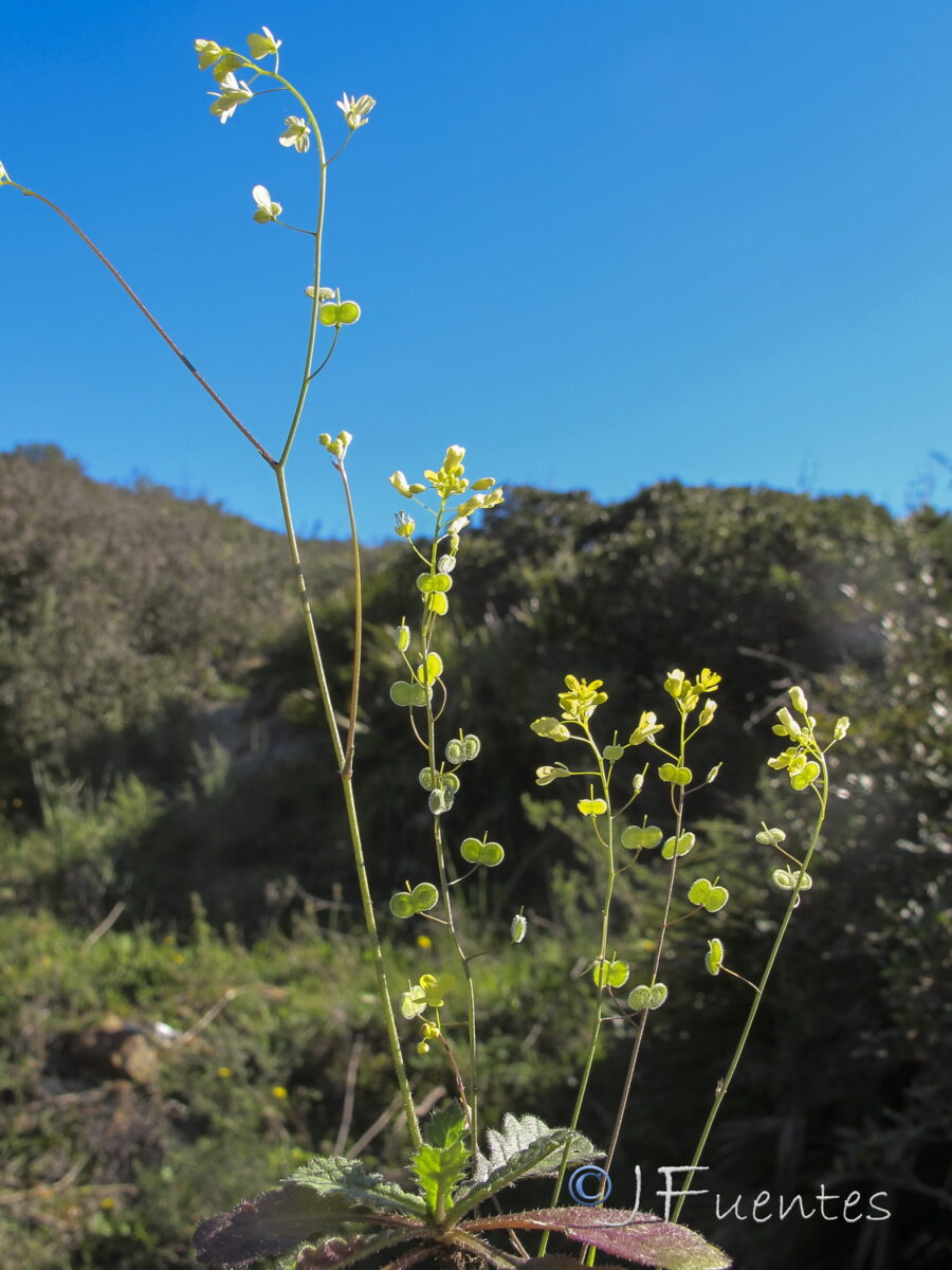 Tallos ramosos, glabros o con pelos patentes sólo en la base. Hojas 2–12 x 1–3 cm, en roseta basal delimitada y laxa, de obovadas a oblanceoladas, pinnatífidas o pinnatisectas, liradas; las caulinares 0,7–1,3 x 0,2–0,5 cm, sésiles, escasas, lineares o las inferiores a veces similares a las basales; todas hírtulas, con sólo pelos setosos laxos en los nervios y márgenes. Racimos ebracteados, laxos, alargados en la fructificación. Flores actinomorfas, hermafroditas, tetrámeras; sépalos 1,5–2 mm, amarillentos, glabros, apenas gibosos; pétalos 2,5–4 mm, atenuados, con uña poco manifiesta, amarillos; estambres 6, tetradínamos, los internos con filamentos alados; ovario súpero, con 1 primordio por lóculo. Frutos en silícula angustisepta, de 2–3 x 4–6 mm, planos, dídimos; valvas orbiculares o suborbiculares, engrosadas en el margen formando un reborde anular, glabras o con pelos cortos densos y pelos mazudos más largos en las caras, éstos más abundantes en el margen, con las semillas prominentes; pedicelos 8–11 mm, patentes, glabros; estilo 1–2,5 mm