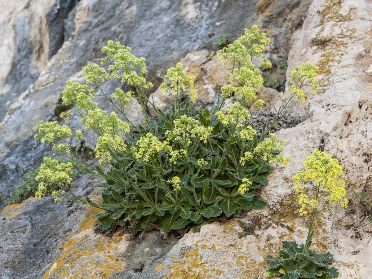 Cepa consistente, con restos foliares secos. Tallos ramosos y glabrescentes en el tercio superior, tomentosos en la base. Hojas 3–12(15) x (0,8)1–3(5) cm, en roseta basal delimitada y densa, obovadas u oblanceoladas, dentadas o pinnatífidas, a menudo liradas, rara vez casi enteras; las caulinares (1)2–4 x 0,3–1,4 cm, de obovadas a lanceoladas, sésiles o semiamplexicaules, numerosas; todas tomentosas, blanco–cinéreas, con pelos de tamaño uniforme. Inflorescencia ebracteada, paniculado–compuesta, muy ramosa, con racimos densos en la fructificación. Flores actinomorfas, hermafroditas, tetrámeras; sépalos 2–3 mm, amarillo–verdosos, glabros, apenas gibosos; pétalos 4,5–6 mm, auriculados en la base y con uña muy corta, amarillos; estambres 6, tetradínamos, con filamentos filiformes; ovario súpero, con 1 primordio por lóculo. Frutos en silícula angustisepta, de 3–4,5 x 6–7 mm, planos, dídimos; valvas suborbiculares o elípticas, con un reborde anular en el margen, glabras o papilosas en el reborde y con pelos mazudos en el disco, con las semillas poco o nada prominentes; pedicelos 6–8 mm, erecto–patentes, glabros o vilosos; estilo 2–2,5 mm