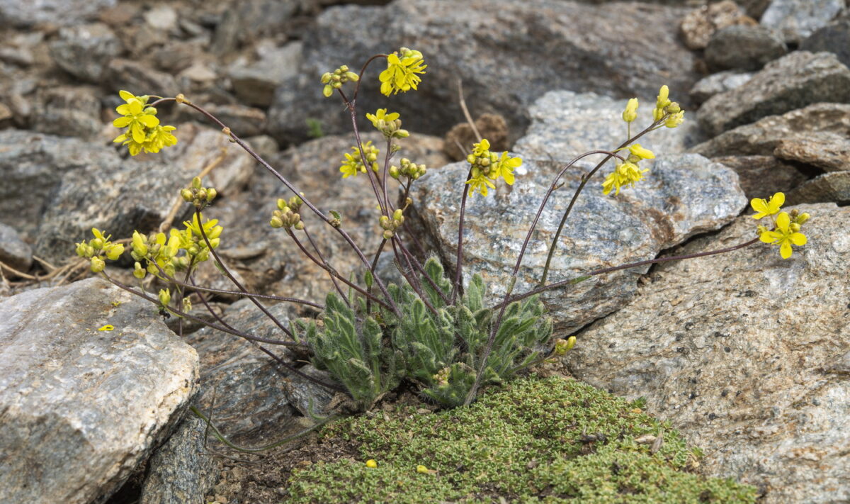 Cepa lignificada, a menudo con abundantes restos foliares. Tallos ramosos en la mitad superior, de glabrescentes a densamente pelosos en la base, glabros o poco pelosos en la parte superior, a menudo purpúreos. Hojas 2–10 x 0,5–2 cm, en roseta basal delimitada y densa, lanceoladas u oblongo–lanceoladas, subagudas, sinuado–dentadas o pinnatífidas; las caulinares 3–6, de 0,5–4 x 0,1–0,3 cm, de tamaño mucho menor que las basales, bracteiformes, lineares, enteras o sinuado–dentadas, sésiles o dilatadas en la base; todas de ordinario de color verde o cinéreo, a veces con tintes violáceos, con pelos cortos aterciopelados o largos lanosos, blanquecinos, de tamaño uniforme. Inflorescencia ebracteada, laxa, con 2–3 ramas; racimos laxos y alargados en la fructificación. Flores actinomorfas, hermafroditas, tetrámeras; sépalos 1,5–3 mm, amarillentos, glabros o poco pelosos, apenas gibosos; pétalos 3–6,5 mm, auriculados en la base y con uña muy corta, amarillos; estambres 6, tetradínamos, con filamentos filiformes; ovario súpero, con 1 primordio por lóculo. Frutos en silícula angustisepta, de 5–6,5 x (6)8–11 mm, planos, dídimos; valvas suborbiculares o elípticas, con el margen plano y brevemente alado, glabras o con algunos pelos mazudos en el disco, con las semillas prominentes; pedicelos (7) 9–12 mm, erecto–patentes, glabros o villosos; estilo 2–4 mm