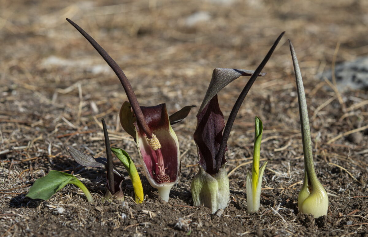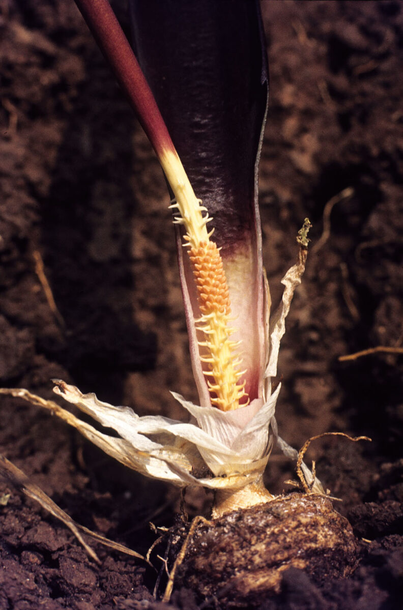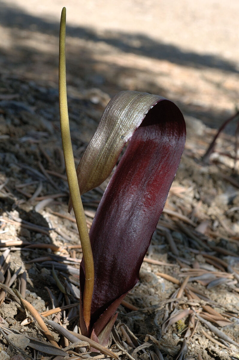 Acaule, glabra; tubérculo globoso, con profilos papiráceos. Hojas todas basales, pecioladas; limbo hasta 7 cm, elíptico, oblongo o linear–lanceolado. Inflorescencia con pedúnculo más corto que los pecíolos; espata 8–14 cm, con el tubo cerrado en casi toda su longitud, globoso; lámina linear–lanceolada, de color púrpura por la cara interna y purpúreo–verdosa por la externa. Espádice más corto o más largo que la espata, recto, no engrosado hacia el extremo, purpúreo, con flores unisexuales agrupadas en la mitad inferior, arriba las masculinas fértiles, luego un espacio desnudo, después las femeninas estériles (pistilodios) decurrentes en el espádice, y las femeninas fértiles en la base contiguas con las estériles, todas muy reducidas, sin perianto, sésiles; estilos 0,2–1 mm. Infrutescencia hipogea, constituida por numerosas bayas piriformes, con tonalidades purpúreas en la madurez