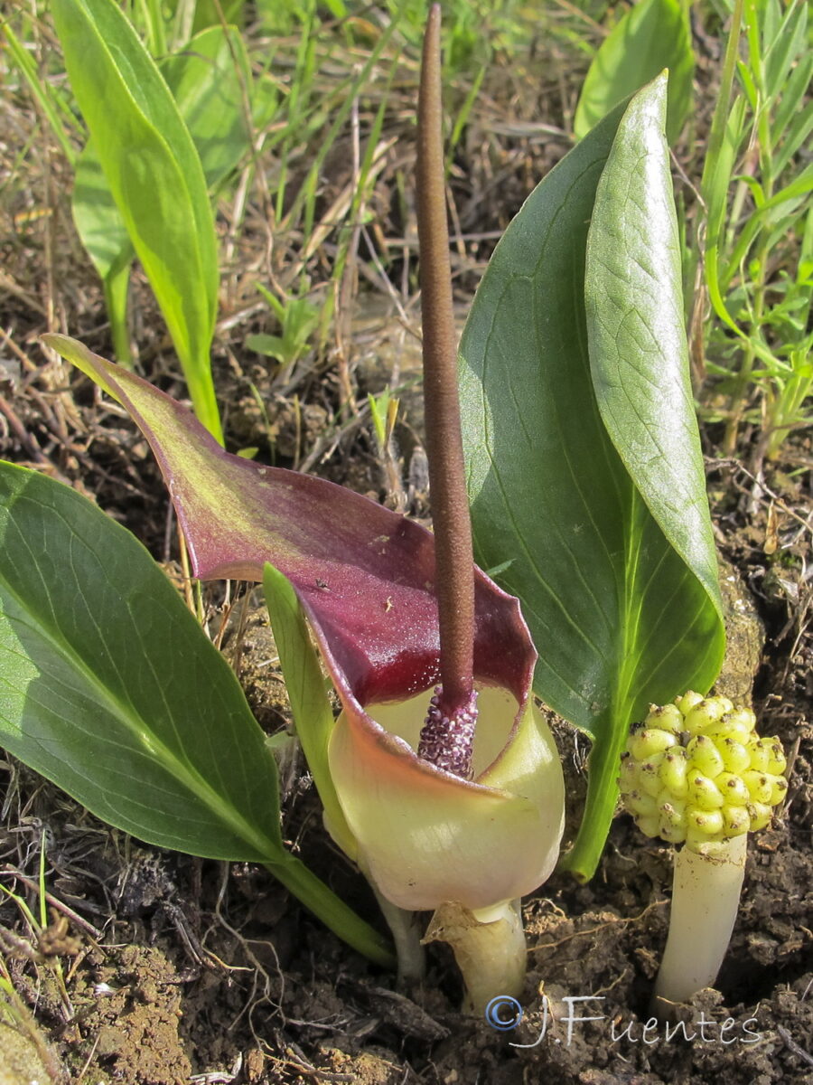 Acaule, glabra; tubérculo globoso, con profilos papiráceos. Hojas todas basales, pecioladas; limbo hasta 8 cm, oblongo–lanceolado o lanceolado. Inflorescencia con pedúnculo más corto que los pecíolos; espata 7–14 cm, abierta casi hasta la base; tubo globoso; lámina linear–lanceolada, de color púrpura por la cara interna y purpúreo–verdosa por la externa, blanquecina hacia la base. Espádice generalmente más corto que la espata, recto, no engrosado hacia el extremo, purpúreo, fétido, con flores unisexuales agrupadas en la mitad inferior, arriba las masculinas fértiles, más abajo un espacio desnudo y las femeninas fértiles en la base, a veces con flores femeninas estériles (pistilodios) dispersas entre las flores femeninas fértiles, todas muy reducidas, sin perianto, sésiles; estilos 0,4–0,7 mm. Infrutescencia hipogea, constituida por numerosas bayas piriformes, con tonalidades purpúreas en la madurez