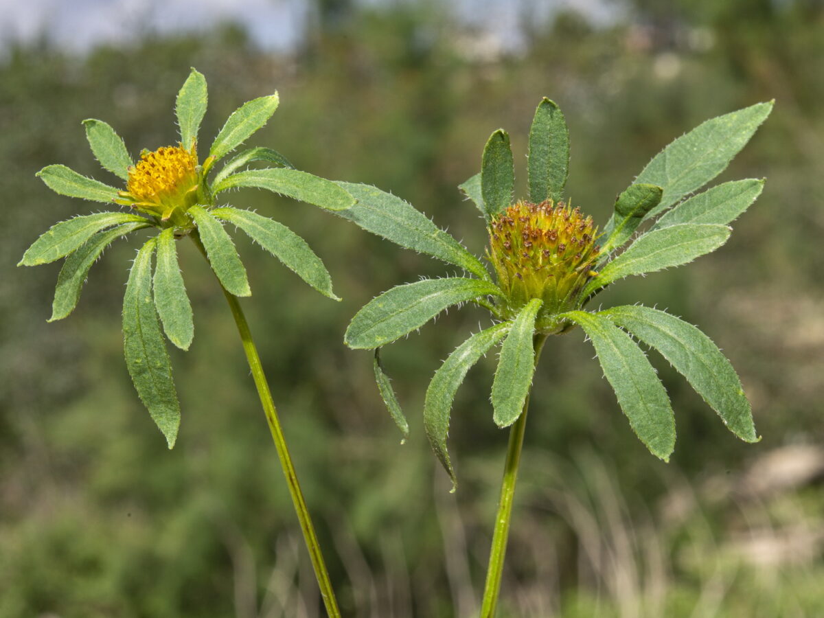 Anual, con pelos adpresos esparcidos. Tallos erectos, subcuadrangulares, ramificados. Hojas opuestas, las inferiores y medias 3(5)–folioladas; folíolos lanceolados u ovado–lanceolados, aserrados, los laterales peciolulados. Capítulos discoides, terminales, en cimas dicasiales; involucro con 2 filas de brácteas, las externas de 1,5–2,5 veces más largas que las internas, foliáceas, lineares, ciliadas, las internas ovadas u ovado–lanceoladas, con margen escarioso; receptáculo con brácteas interseminales. Flores flosculosas, amarillas, con nervios oscuros. Aquenios 4,5–7 mm, comprimidos, anchamente obovoideos, con una costilla en cada cara y pelos antrorsos en toda la superficie; vilano formado por 2 aristas de 2,5–3,5 mm, retrorso–híspidas