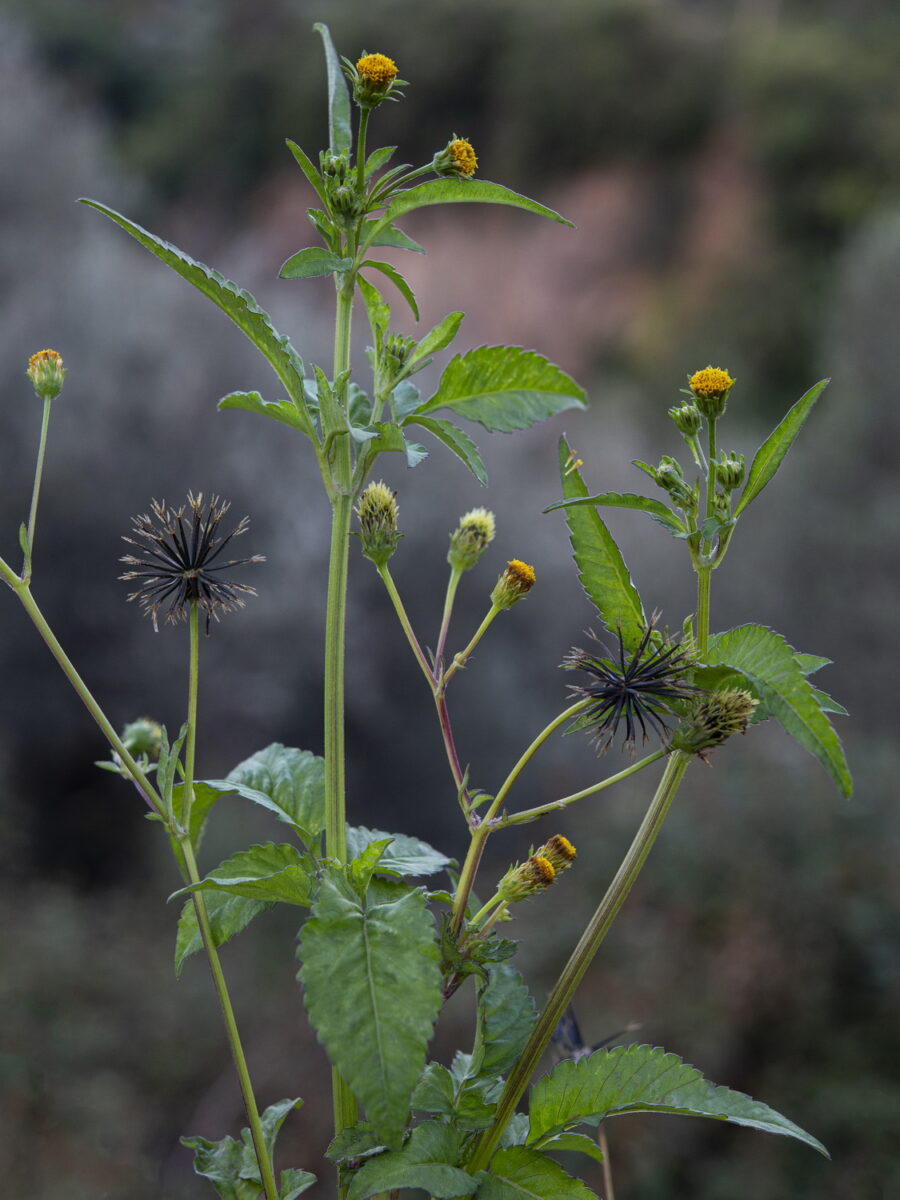 Anual, con pelos adpresos esparcidos. Tallos erectos, subcuadrangulares, ramificados. Hojas opuestas, las inferiores y medias pecioladas, trifolioladas; folíolos lanceolados, ovado–lanceolados o elípticos, aserrados o crenados, los laterales sésiles. Capítulos 7–12 mm de diámetro, discoides o radiados, terminales, en corimbos laxos; involucro con 2 filas de brácteas, las externas más cortas o algo más largas, lineares, ciliadas, las internas ovadas u oblongo–lanceoladas, con margen escarioso; receptáculo con brácteas interseminales. Flores amarillas, con nervios oscuros, las externas hemiliguladas, más cortas que el involucro, a menudo ausentes; las internas flosculosas. Aquenios 6–12 mm, oblongoideos o lineares, con pelos antrorsos en las costillas y en el ápice; vilano formado por 2–3(4) aristas de 2,5–3 mm, retrorso–híspidas