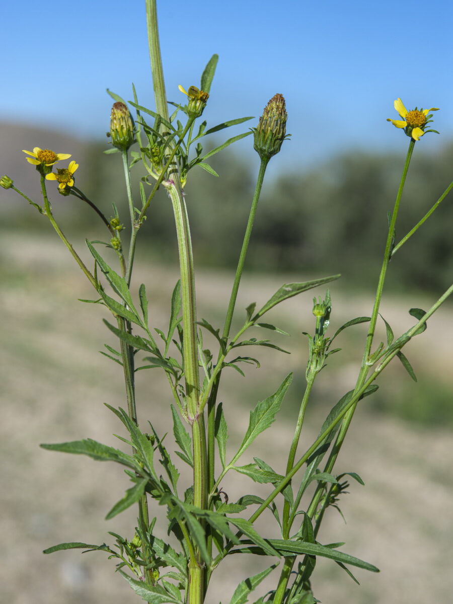 Anual, con pelos adpresos esparcidos. Tallos erectos, subcuadrangulares, ramificados. Hojas opuestas, las inferiores y medias pinnadas; pinnas ± estrechamente lanceoladas, aserradas o subenteras, las inferiores de cada hoja generalmente pinnatisectas. Capítulos 7–15 mm de diámetro, discoides, terminales, en cimas dicasiales; involucro con 2 filas de brácteas, lanceoladas u oblongas, las externas más cortas que las internas; receptáculo con brácteas interseminales. Flores flosculosas, amarillas, con nervios oscuros. Aquenios 7–14 mm, lineares, con pelos antrorsos en las costillas; vilano formado por (2)3–4 aristas de 1–2,5 mm, retrorso–híspidas