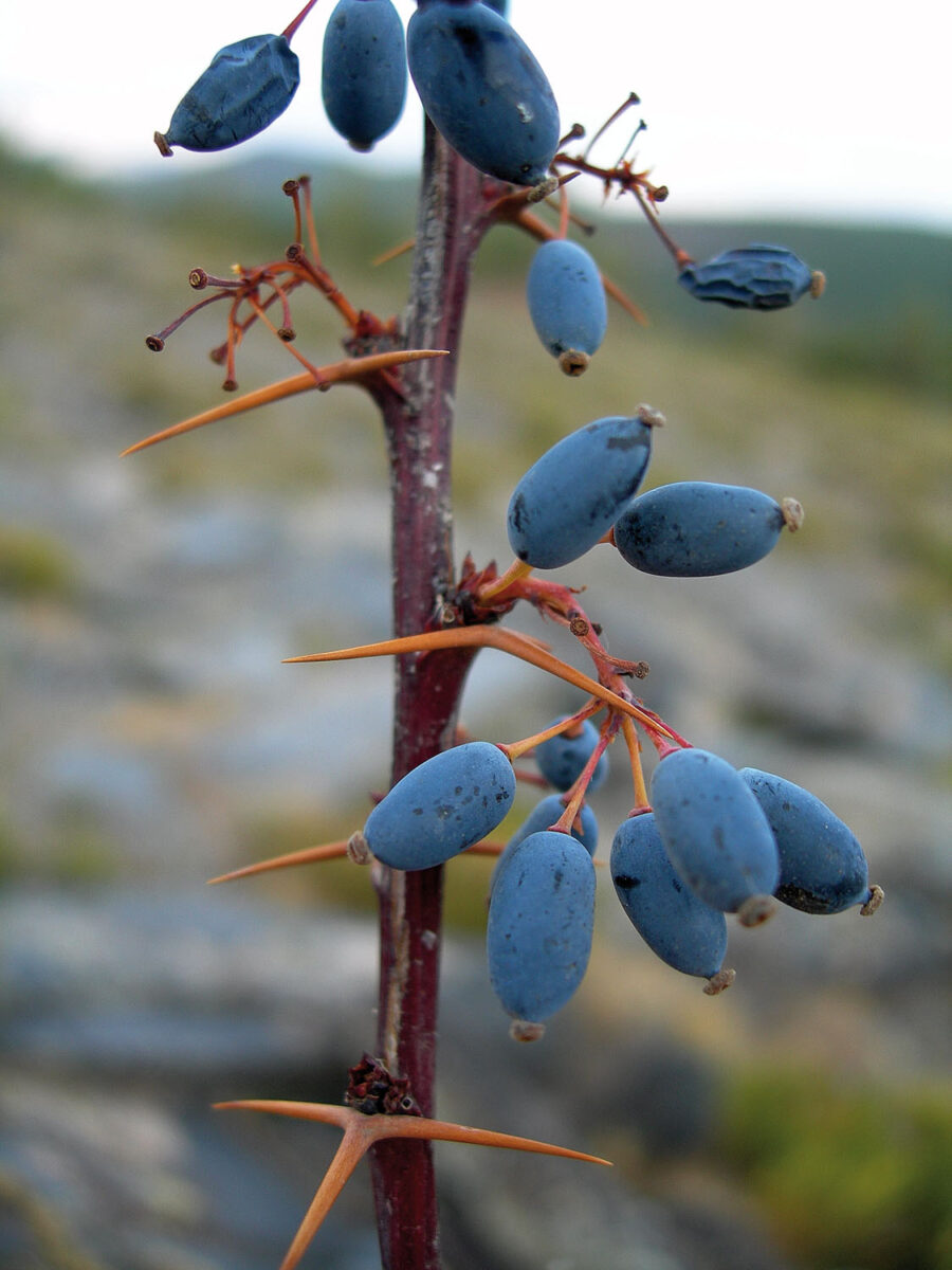 Arbusto espinoso. Tallos ramificados desde la base, asurcados, los de primer año rojizos; espinas simples o 3(8)–palmeadas, fuertes, amarillas, la central generalmente más larga que las laterales. Hojas 5–15(20) x 3–10 mm, fasciculadas sobre brotes cortos en la axila de las espinas, obovadas u oblanceoladas, atenuadas en la base en pecíolo corto de (1)2–5(7) mm, a veces sésiles, enteras o dentadas, con (1)2–7(9) dientes a cada lado. Flores 4–8(13), de 4–6 mm de diámetro, en racimos axilares corimbiformes, hermafroditas, actinomorfas, amarillas, cortamente pedunculadas, a veces sésiles; sépalos 6(7); pétalos 6(7), nectaríferos; estambres 6(7), con dehiscencia valvar. Bayas 5–9 mm, oblongas, negro–azuladas, pruinosas