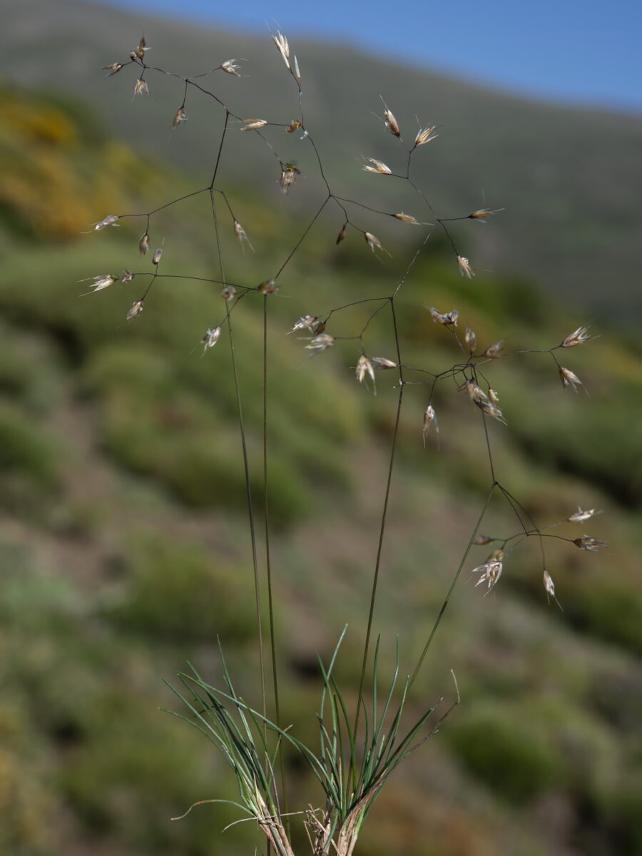 Lámina de las hojas plana, blanda, glabra o pelosa. Panícula piramidal, muy laxa. Espiguillas 16,5–18 mm, péndulas, con 2–3 flores que se separan entre sí en la madurez; glumas subiguales, con 7–10 nervios; callo de menos de 1 mm de anchura, suborbicular a estrechamente elíptico, obtuso; lema de la flor inferior 15–17 mm, bidentado o bífido, con (2)4 nervios +/- excurrentes en el ápice, los 2 centrales en forma de arístulas de 3–5 mm, menores que las glumas o sobrepasándolas 1-2(3) mm, rojizas, y 1-2 laterales terminados en sétulas o dientes agudos de 0,5-1 mm, blancos o rojizos. Arista 21–30 mm, dorsal, geniculada; lodículas 0,6-0,8 mm, triangulares, ovado-lanceoladas u ovadas, enteras o con un pequeño diente lateral