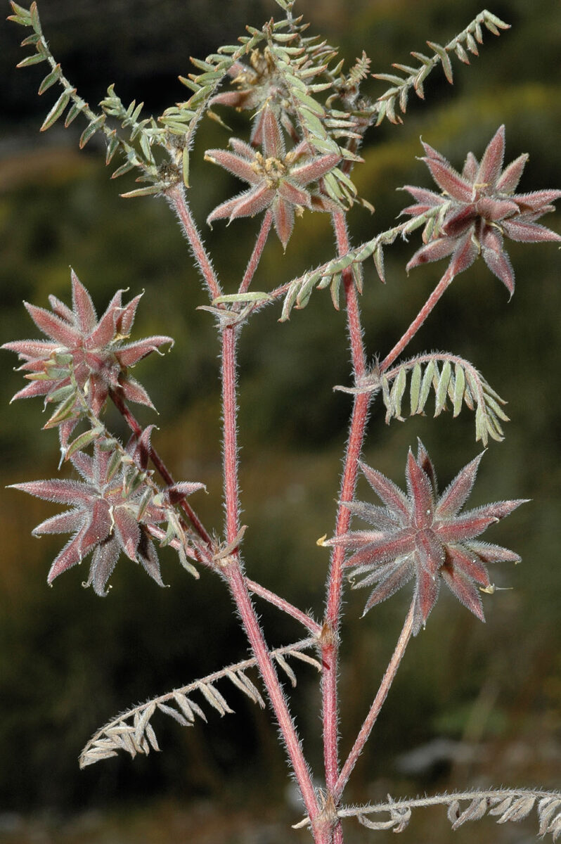 Unicaule o ramificada en la base, con indumento de pelos basifijos hasta de 2 mm. Hojas 2–9 cm, imparipinnadas, con 5–11 pares de folíolos enteros; estípulas 2,5–7 mm, verdosas, largamente soldadas al pecíolo; folíolos 2–16 x 1,5–5 mm, estrechamente elípticos, con frecuencia obtusos, seríceos por ambas caras. Inflorescencias en racimo, densas, acabezueladas, con 4–15 flores papilionadas; pedúnculo (0,3)1–12 cm. Cáliz 5–7 mm, campanulado, cubierto de pelos blancos y negros; dientes 1,5–3,8 mm, ± iguales. Corola amarilla o violeta; estandarte 5–12 mm, más largo que las alas y la quilla; alas más largas que la quilla. Estambres 10, diadelfos. Legumbre 8–15 x 2,4–3 mm, patente, sentada o subsentada, recta o algo curvada, de pico corto, aquillada en el vientre, de dorso ± hundido sobre todo en la mitad inferior, bilocular, con indumento muy variable; legumbres maduras agrupadas en forma estrellada