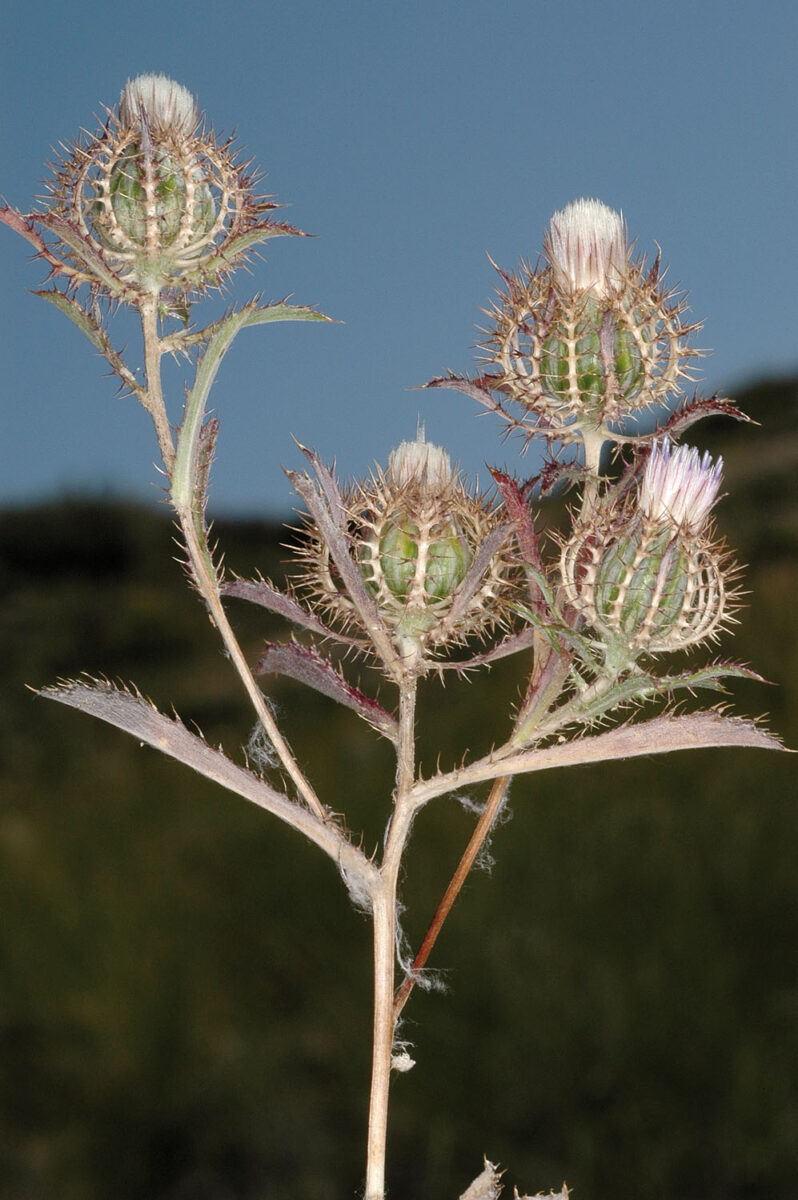 Anual, espinulosa, araneosa. Tallos simples o ramificados, ± flocoso–lanuginosos. Hojas alternas, estrechamente oblanceoladas, dentado–espinulosas, araneosas; las involucrantes arqueadas hacia dentro, formando una esfera a cierta distancia del capítulo, pectinadas, bipinnatisectas, con segmentos lineares y espinosos, iguales o algo más largas que el involucro. Capítulos 1–3, discoides, a veces radiados, terminales; involucro 12–16 x 7–14 mm; brácteas medias lanuginosas, de margen escarioso y ápice mucronado–espinuloso; receptáculo paleáceo. Flores flosculosas, rosadas; a veces algunas periféricas hemiliguladas, neutras. Aquenios 2–3 mm, obovoideos, densamente seríceos, con pelos sinuosos de longitud doble a la del cuerpo; vilano 8–12 mm, de setas plumosas soldadas en la base formando un anillo viloso