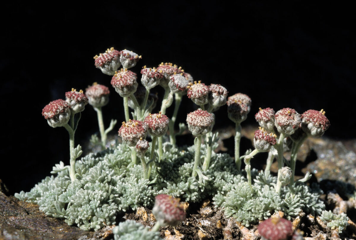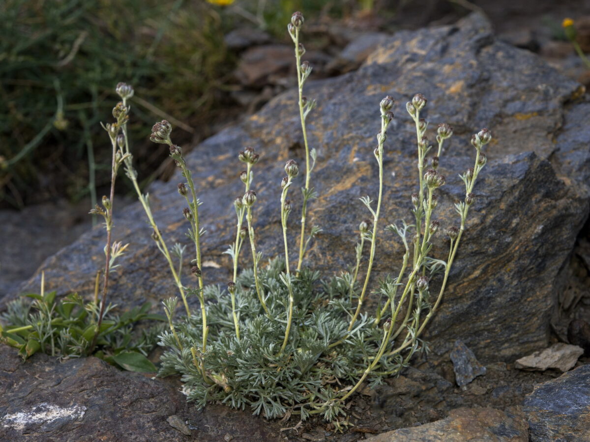 Matilla cespitosa, blanco–serícea. Tallos erectos, simples o poco ramosos. Hojas alternas, las basales de hasta 1,5(2) cm, numerosas, pecioladas, 2–3–palmatisectas, de contorno flabelado; las superiores tripartidas o enteras; segmentos (0,3)0,5–1,2(1,5) mm de anchura. Capítulos 5–8 mm de diámetro, disciformes, erectos, hemisféricos, solitarios o 2–4(5) en panícula corimbiforme; brácteas en varias filas, ovado–oblongas, con margen escarioso oscuro, muy pelosas; receptáculo glabro. Flores flosculosas, numerosas (30–80), las externas femeninas, las internas hermafroditas, de ápice púrpura–oscuro y muy peloso. Aquenios sin vilano