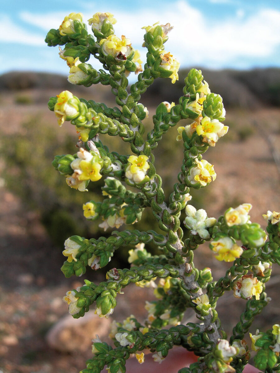 Arbusto muy ramificado, con polimorfismo sexual. Tallos muy tenaces, los jóvenes algo péndulos, blanco–tomentosos. Hojas 2,5–7(11) mm, alternas, imbricadas, ± adpresas, de ovado–suborbiculares a ovado–lanceoladas, involutas, coriáceas, gruesas y algo carnosas, de haz blanco–tomentoso y envés glabro. Inflorescencias en fascículos terminales, en el extremo de las ramas o en el de braquiblastos laterales foliosos, con 3–10 flores y brácteas foliáceas. Flores 2,5–4,5 mm, actinomorfas, unisexuales o hermafroditas, tetrámeras, apétalas; hipanto 1,5–2,5 mm, tomentoso; sépalos 1–1,5 mm, petaloideos, amarillos. Estambres 8. Ovario súpero. Fruto 3–4 mm, nuciforme, encerrado en el hipanto