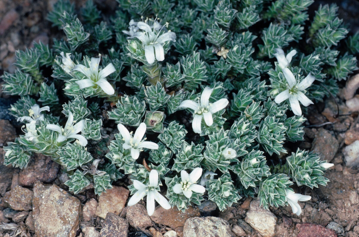 Planta pulviniforme, formando almohadillas compactas; cepa leñosa muy ramificada. Tallos ramificados, con entrenudos superiores pubescentes. Hojas 1,5–3 x 1–2 mm, opuestas, connadas, densamente imbricadas, ovadas u ovado–triangulares, subobtusas, no aristadas, con los nervios marginales formando un reborde grueso y blanco, glabras, a veces vellosas por el haz, ciliadas en la base. Flores solitarias o en grupos de 2–4, que sobresalen netamente del pulvínulo, actinomorfas, hermafroditas, pentámeras. Sépalos 3,5–6 mm, ovado–lanceolados, sin mucrón, con margen escarioso y ciliado, glabros. Pétalos más largos que los sépalos, enteros, blancos. Estilos 3. Cápsula ligeramente exerta, ovoidea, con 6 dientes. Semillas reniformes, reticuladas, negras, con células de la testa prominentes