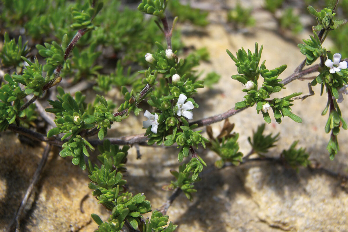 Tallos postrados, radicantes, pelosos. Hojas 5–8 x 1–1,2 mm, espatuladas, planas, enteras, algo crasas, glabras, ciliadas hacia la base, con glándulas esferoidales. Flores en grupos de 2(4), rodeadas de fascículos de hojas; brácteas foliáceas y bractéolas de hasta 5 mm, lanceoladas, agudas, ciliadas. Cáliz c. 5 mm, de acampanado a tubular, con 10 nervios; dientes c. 1,5 mm, subiguales, a veces los tres superiores algo más anchos, ciliados. Corola 6–7 mm, bilabiada, pelosa, blanco–crema o rosada; labio superior bilobulado y el inferior trilobulado y de mayor tamaño. Estambres exertos. Núculas c. 2 x 1 mm, subtrígonas, de superficie papilosa