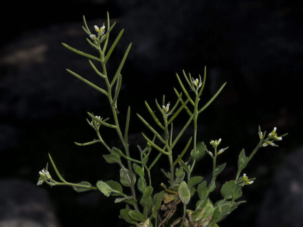 Uno o varios tallos erectos, simples, a veces ramificados, pubescentes, con pelos de 2–4 brazos, sobre todo en la parte inferior, glabrescentes en la superior. Hojas basales atenuadas en pecíolo, oblanceoladas o espatuladas, caducas; las caulinares 7–8, de 0,4–3(3,7) x 0,2–1,8(2) cm, sésiles, ovadas o elípticas, sagitadas, con aurículas agudas y margen denticulado, todas con indumento similar al del tallo. Racimo ebracteado, generalmente con eje zigzagueante en la fructificación. Flores actinomorfas, hermafroditas, tetrámeras; sépalos 1,5–2 mm, los laterales gibosos en la base; pétalos 2,8–4 mm, con uña manifiesta, blancos; estambres 6, tetradínamos; ovario súpero, con numerosos primordios por lóculo. Frutos en silicua, de 18–38 x 0,8–1 mm, lineares, algo torulosos en la madurez; valvas con nervio medio marcado, glabras o pubescentes; pedicelos 1,5–5(8) mm, erectos o erecto–patentes, ligeramente más delgados que el fruto; estilo 0,3–0,4 mm. Semillas ápteras, de color marrón claro