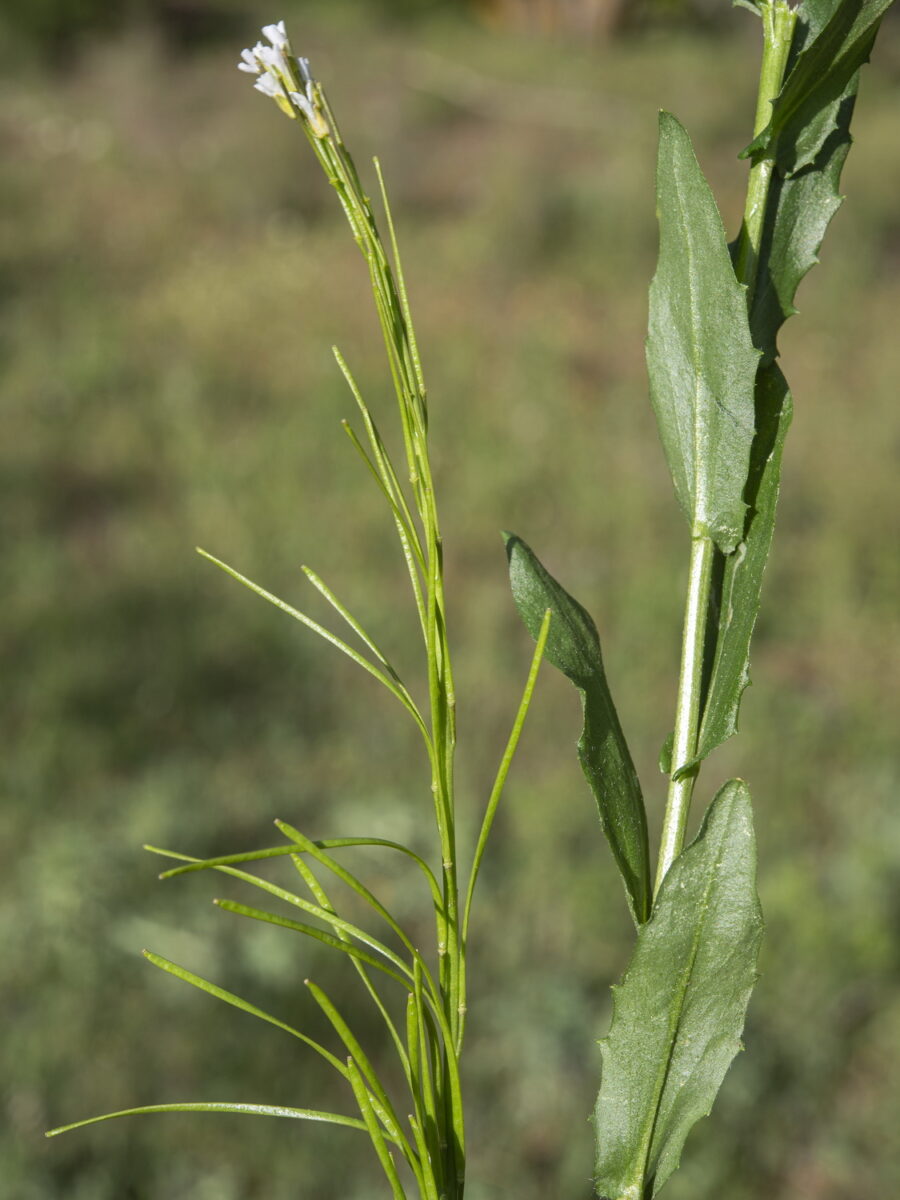 Uno o varios tallos erectos, simples o ramificados en la mitad superior, con pelos ramificados, sobre todo en la base. Hojas basales 3,5–4,5 x 1,5–2 cm, gradualmente estrechadas en el pecíolo, oblanceoladas o espatuladas, crenadas, caducas; las caulinares 3–13, de 1,5–2,5 x 0,5–1,3 cm, sésiles, ovadas, sagitadas o auriculadas en la base, dentadas, todas con indumento similar al del tallo. Racimo ebracteado, que se alarga mucho en la fructificación. Flores actinomorfas, hermafroditas, tetrámeras; sépalos 1,2–3 mm, los laterales gibosos en la base; pétalos 2,5–5 mm, con uña manifiesta, blancos; estambres 6, tetradínamos; ovario súpero, con numerosos primordios por lóculo. Frutos en silicua, de 40–45 mm, lineares, casi planos, glabros; pedicelos (5)6–15 mm, erectos o erecto–patentes, más delgados que el fruto; estilo 0,3–0,4 mm. Frutos 41-52 mm. Semillas con ala estrecha, negruzcas