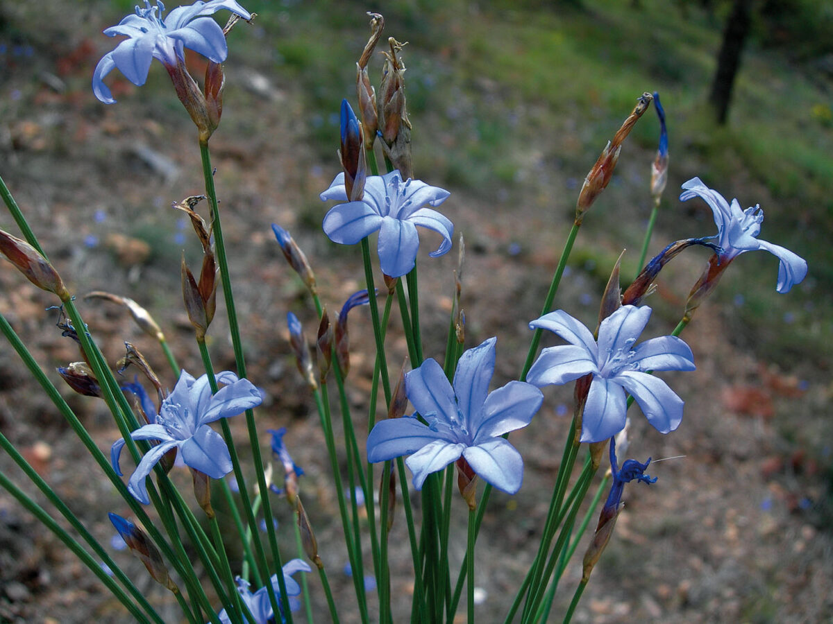 Perenne, escaposa, glabra; rizoma fibroso con numerosas raíces fasciculadas. Hojas (5)7–8,5(14) x 0,3–0,4 cm, todas basales, reducidas a vainas membranáceas, trinervadas, prolongadas en un mucrón, pardo–amarillentas o púrpuras. Escapos junciformes, numerosos, generalmente simples. Brácteas 1–3, cuspidadas; bractéolas 1–5, alrededor de cada flor, obtusas. Flores terminales, sésiles, solitarias o en cimas de 2(3), actinomorfas, hermafroditas, trímeras. Tépalos 6, de (13)15–20(25) mm, libres, oblanceolados, azules o raramente blancos, aproximados y formando un tubo en la parte basal y con limbo patente. Estambres 6; filamentos glabros; anteras dorsifijas, amarillas. Ovario súpero; estigma trilobado. Cápsula 3,5–4 mm, inclusa, apiculada; semillas 3, ovoideas, rugosas, negras