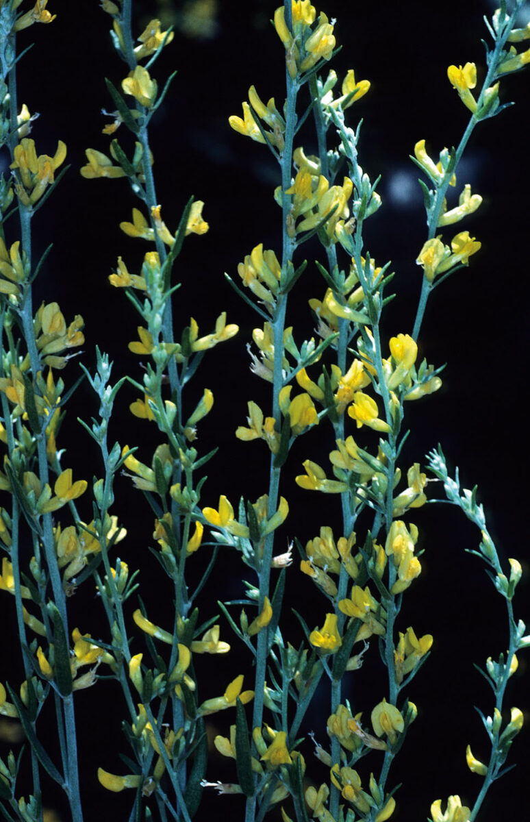 Tallos con ramas jóvenes erectas, seríceas. Hojas de ordinario unifolioladas, por excepción alguna trifoliolada, con limbo de 12–25(30) x 2–4,5 mm, linear–lanceolado, con indumento escaso y adpreso. Fascículos axilares con (1)2–4 flores, subsésiles, agrupados a modo de espigas de hasta 20 cm; brácteas linear–elípticas. Flores 6–8 mm, papilionadas. Cáliz 4–5 mm, campanulado, adpreso–pubescente; dientes c. 1,5 mm, deltoides. Corola amarilla; estandarte con lámina c. 3,5 x 3,5 mm, suborbicular, truncada en la base; alas poco más largas que la quilla. Androceo submonadelfo. Legumbre 2,5–3 x c. 1,5 mm, obovoide, inclusa, fuertemente rugosa, con apículo lateral, glabra. Semillas c. 1,5 mm