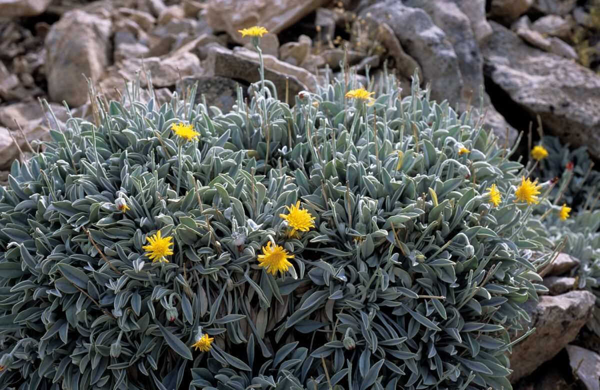 Cespitosa, de cepa leñosa y ramificada; indumento denso de pelos estrellados mezclados con pelos glandulíferos negruzcos al menos en la mitad superior. Tallos erectos, simples, aparentemente escapiformes. Hojas alternas, en su mayoría basales, dispuestas apretadamente, elípticas, oblanceoladas o espatuladas, enteras, pecioladas; las caulinares por lo general bracteiformes. Capítulos homógamos, pedunculados, solitarios; involucro (11)13–17 x 8–12 mm, con brácteas en 2–3 filas, planas; receptáculo esparcidamente peloso. Flores liguladas, amarillas, las externas de dorso ± purpúreo. Aquenios 3–3,5 mm, costillados; vilano 6,5–8 mm, de pelos denticulados