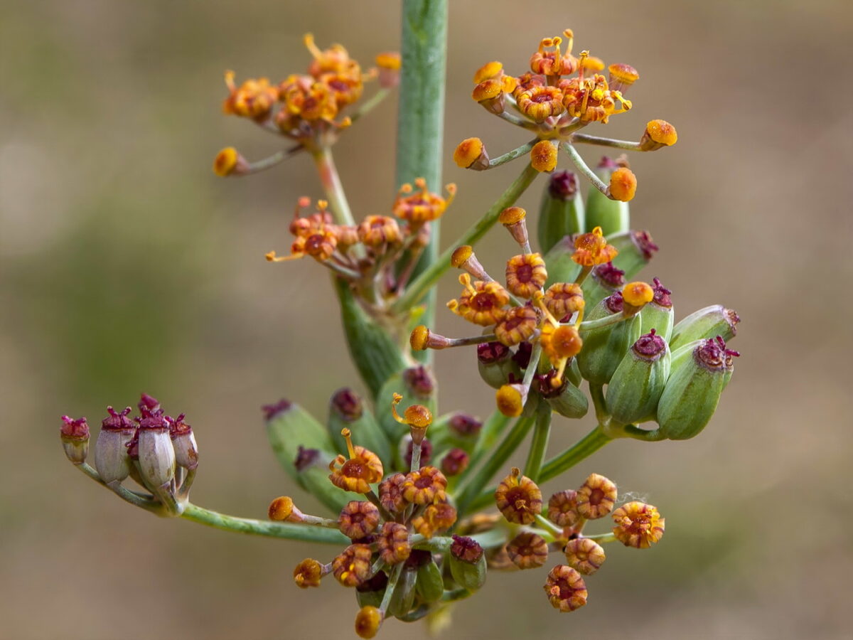 Planta herbacea perennis, glabra. Caules 50-160(190) cm longi, erecti, sparse ramosi. Folia basalia sparsa, 9-22 x 2.5-5 cm, 3-5 pinnatisecta, ambitus triangularis versus ovatus, lobuli terminales (0.4)0.6-4.5 x 0.2-0.4 mm, lineares. Folia caulinaria superna in vaginam reducta, interdum parva appendice instructa. Vaginae 8-30(40) x 2-5(6) mm. Umbellae compositae, involucro nullo, radii primari (2)3-5(6), (1)1.5-2.5(3.5) cm longi, parum inaequales. Umbellula involucella nulla, radii secundarii 10-18, 2-5 cm longi. Petala (8)10-12 mm, rubra, interdum margines luteae tinctae. Polen roseus in vivo, luteus in specimene herbariorum. Stylopodium sanguineum. Mericarpia (4)4.5-6(7) x 1-2.2 mm, oblonga versus ellipsoidalia