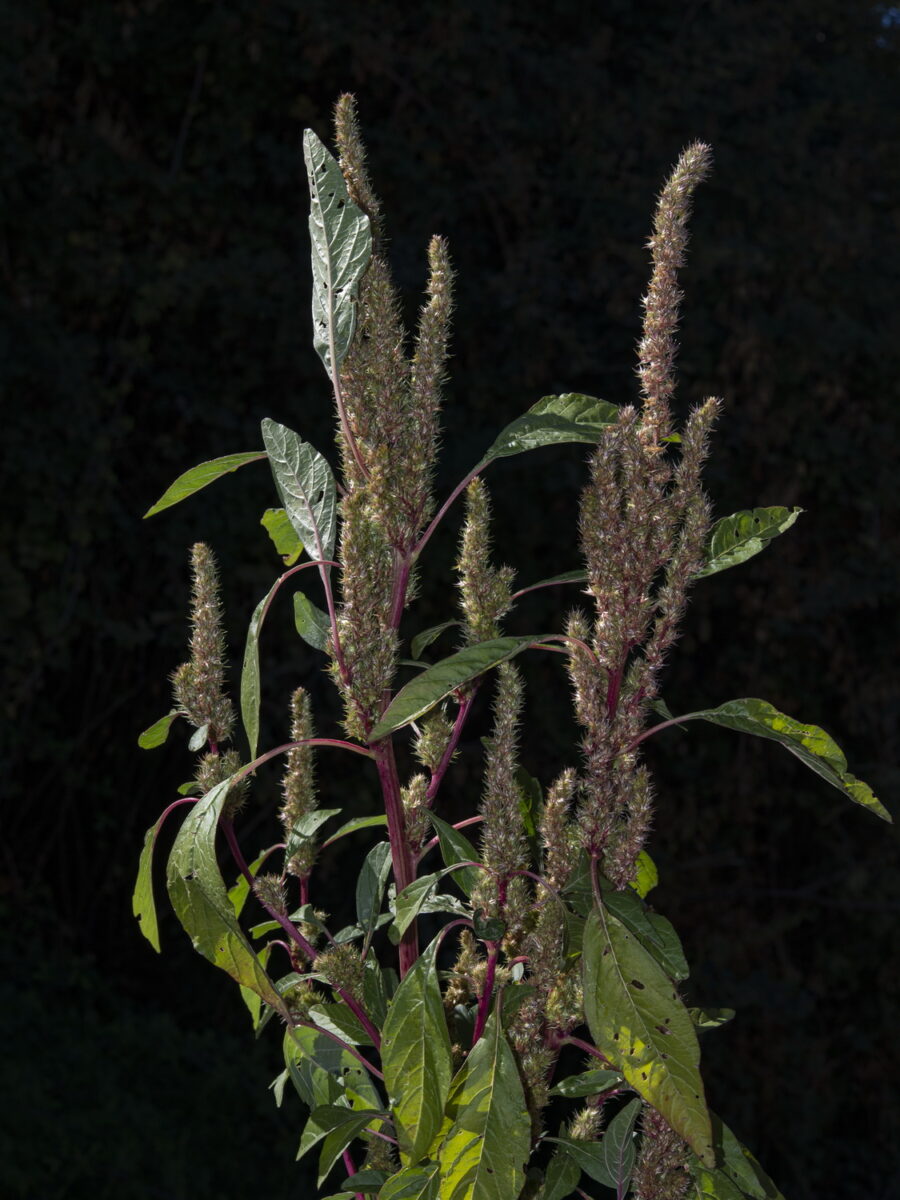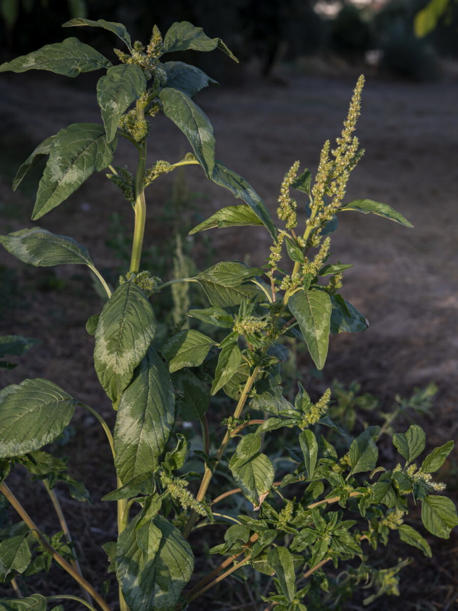 Tallos erectos, pubescentes. Hojas de hasta 4 x 2 cm, de ovado-lanceoladas a Ianceoladas, agudas. Inflorescencia en panículas terminales y laterales. Brácteas de 2-3 mm, de 1-1,5 veces la longitud del periantio, espinosas. Flores femeninas con 5 piezas periantiaIes desiguales, de oblongas a espatuladas, agudas, mucronadas; las más largas de 2-2,5 mm. Pixidios de 1,5-2,5 mm, lisos. Semillas de 1-1,2 mm, de lenticulares a elípticas, lisas, negras