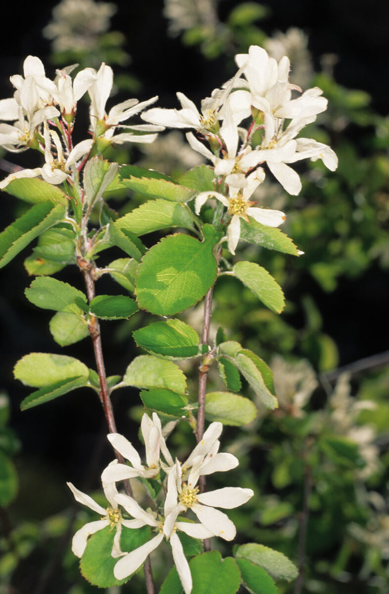 Arbusto caducifolio, inerme. Ramillas jóvenes flocoso–tomentosas, rojizas, con yemas tomentosas. Hojas 10–40 mm, simples, ovales, redondeadas u obovadas, finamente aserradas, de envés glabro (tomentoso al principio), pecioladas. Inflorescencia de 2–10 flores, corimbiforme. Flores 20–30 mm de diámetro, actinomorfas, hermafroditas, pentámeras; sépalos estrechamente triangulares, flocoso–tomentosos en la antesis, persistentes; pétalos largamente oblongo–espatulados, flocoso–tomentosos en la cara externa y hacia la base, de color blanco–crema; estilos 5, libres. Fruto en pomo, de 5–10 mm, globoso, negro–azulado en la madurez, pruinoso; semillas una por lóculo, de testa esclerificada, pardo–rojizas