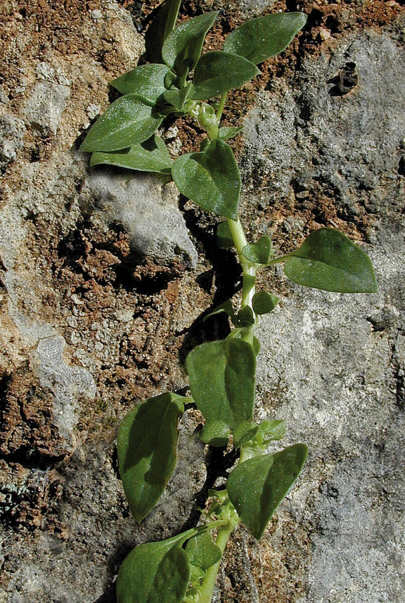 Anual, monoica, glabrescente, tierna, frágil, algo crasa. Tallos ± procumbentes, obtusamente cuadrangulares, nudosos. Hojas 10–20 x 5–20 mm, las basales opuestas, las superiores alternas, pecioladas, ovadas u ovado–rómbicas, enteras de margen hialino y antrorso–escábrido; estípulas membranáceas, soldadas y envainantes. Flores pequeñas, unisexuales, axilares u opositifolias, subsésiles, verdosas, solitarias o en grupos de 2–3; las masculinas con 2(3) tépalos enrollados, soldados en la base, y 7–12 estambres con anteras dorsifijas; las femeninas con perianto tubuloso, con 2–4 dientes, y ovario ínfero unilocular. Aquenio 1,7–2,2 mm, globoso, pardo–oscuro, con manchas blanquecinas