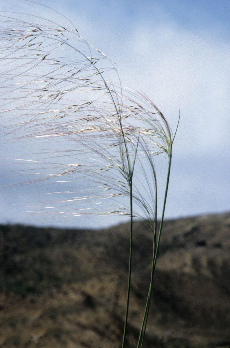 Hojas de vaina glabra, escábrida o pubescente; lámina 4–50 cm, convoluta, de haz pubescente o piloso y envés glabro, escábrido o pubescente; lígula 0,5–2(2,7) mm, escábrida. Panícula 10–50 cm, laxa. Espiguillas unifloras, con pedúnculos de más de 5 mm, flexuosos y escábridos; glumas desiguales, glabras o finamente escábridas en los nervios, la superior (4)5–10 mm, aguda, la inferior (9)10–16(18) mm, setácea; callo (0,6)1–2 mm, pubescente, punzante; lema 3–6(6,5) mm, pubescente; arista 7–13(14) cm, bigeniculada, escábrida; pálea 1–2,5(3) mm, aguda, de dorso pubescente. Anteras hasta 3 mm, glabras en el ápice; cariopsis hasta 5 mm, fusiforme