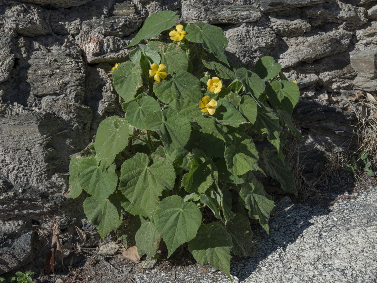 Tallos erectos, ramosos en la parte superior, estrellado–pubescentes, con algunos pelos simples. Hojas 10–20 x 2–17 cm, cordado–orbiculares, acuminadas, ligeramente crenado–serradas, con indumento similar al del tallo, discoloras. Flores actinomorfas, hermafroditas, pentámeras, en cimas axilares paucifloras; epicáliz ausente; sépalos 4–8(10) mm, ovados, agudos, soldados en la mitad inferior, estrellado–pubescentes, en ocasiones con algunos pelos glandulíferos en la base; pétalos 7–12 mm, obovados, truncados o emarginados, amarillos. Fruto en esquizocarpo, con 10–15(20) mericarpos dehiscentes, más largos que el cáliz, cada uno con varias semillas y dos apículos erecto–patentes y ciliados en su ápice, hirsutos, negruzcos. Semillas ovoideo–reniformes, tuberculadas, glabras
