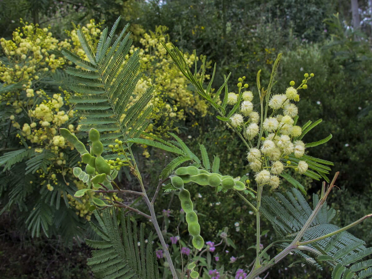 Muy ramificada desde la base, perennifolia, inerme. Hojas sin estípulas, reducidas a filodios laminares de 0,5–1,3 cm de anchura, con (2)3–5 nervios prominentes y paralelos, con una glándula marginal por encima de la base. Inflorescencias en glomérulo globoso de 4–6 mm de diámetro, pedunculadas, axilares, solitarias o en grupos; conflorescencias racemiformes, con 2–3 glomérulos. Flores actinomorfas, pentámeras, amarillas. Cáliz 1,2–1,5 mm, campanulado. Corola 2,1–2,5 mm. Estambres muy exertos. Legumbre hasta 10 cm, comprimida, recurvada y retorcida, ± contraída entre las semillas. Semillas pardo–oscuras, con funículo anaranjado que da una vuelta en torno a la semilla