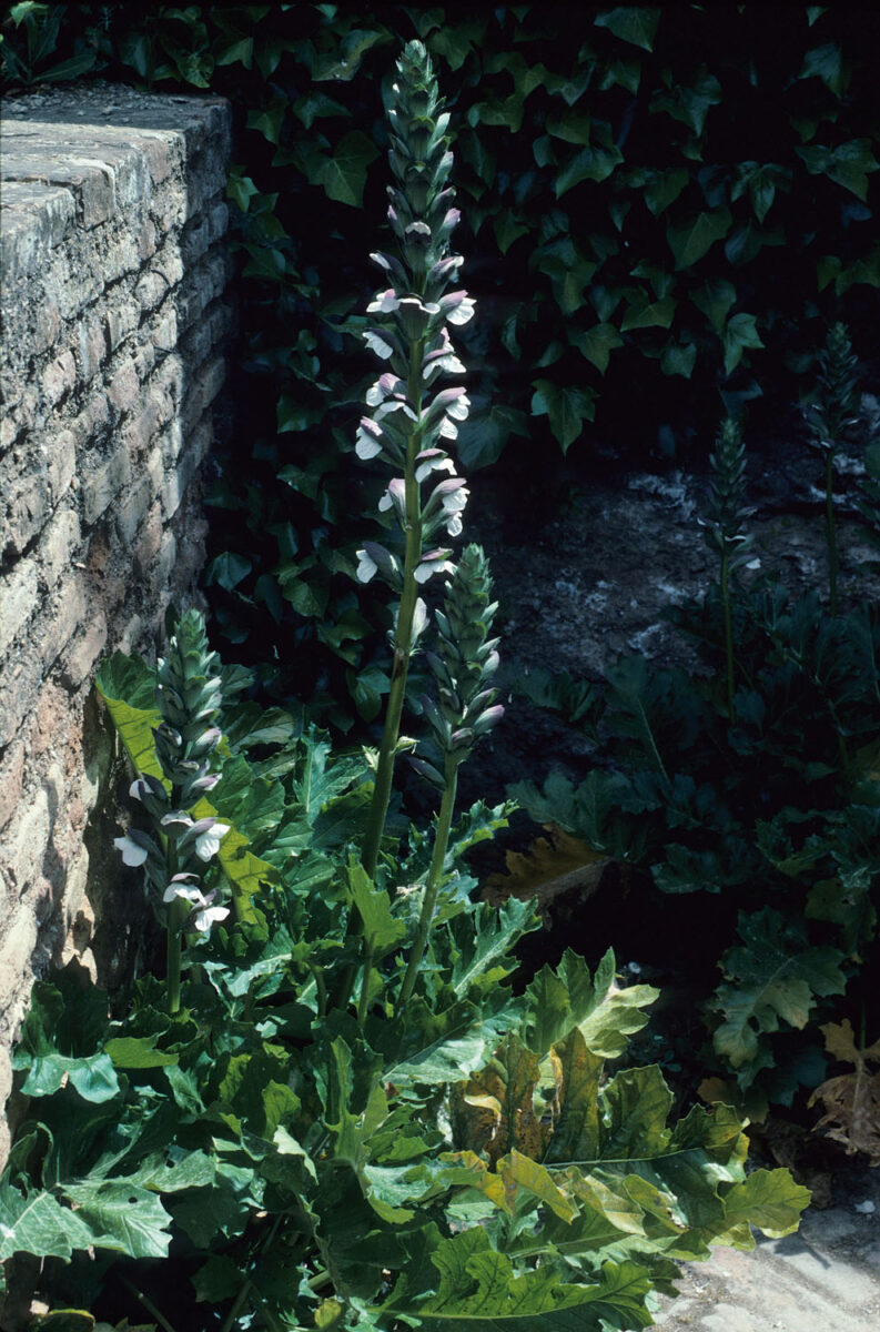 Hierba perenne, rizomatosa, con una gran roseta de hojas basales de la que surge un escapo simple. Hojas basales 20–100 x 5–20(30) cm, largamente pecioladas, ovado–oblongas, pinnatífidas; las caulinares hasta 5 cm, opuestas, sésiles, bracteiformes, ovado–lanceoladas, de ápice espinoso. Inflorescencia 10–60 cm, en espiga terminal densa. Flores zigomorfas, hermafroditas, pentámeras, cada una con una bráctea espinosa y 2 bractéolas laterales. Cáliz con 4 sépalos desiguales, los externos de 4–5,5 cm, ovado–rómbicos, ciliados, los internos 0,6–0,7 cm. Corola 3,5–5,5 cm, con tubo corto y un solo labio (inferior) trilobulado, pubescente, blanquecina, con nerviación purpúrea o violácea. Estambres 4, didínamos. Ovario súpero. Cápsula 2–3,5 cm, ovoide, apiculada, con 2–4 semillas de 10–12 mm, lisas