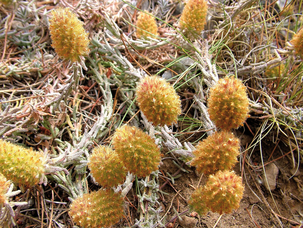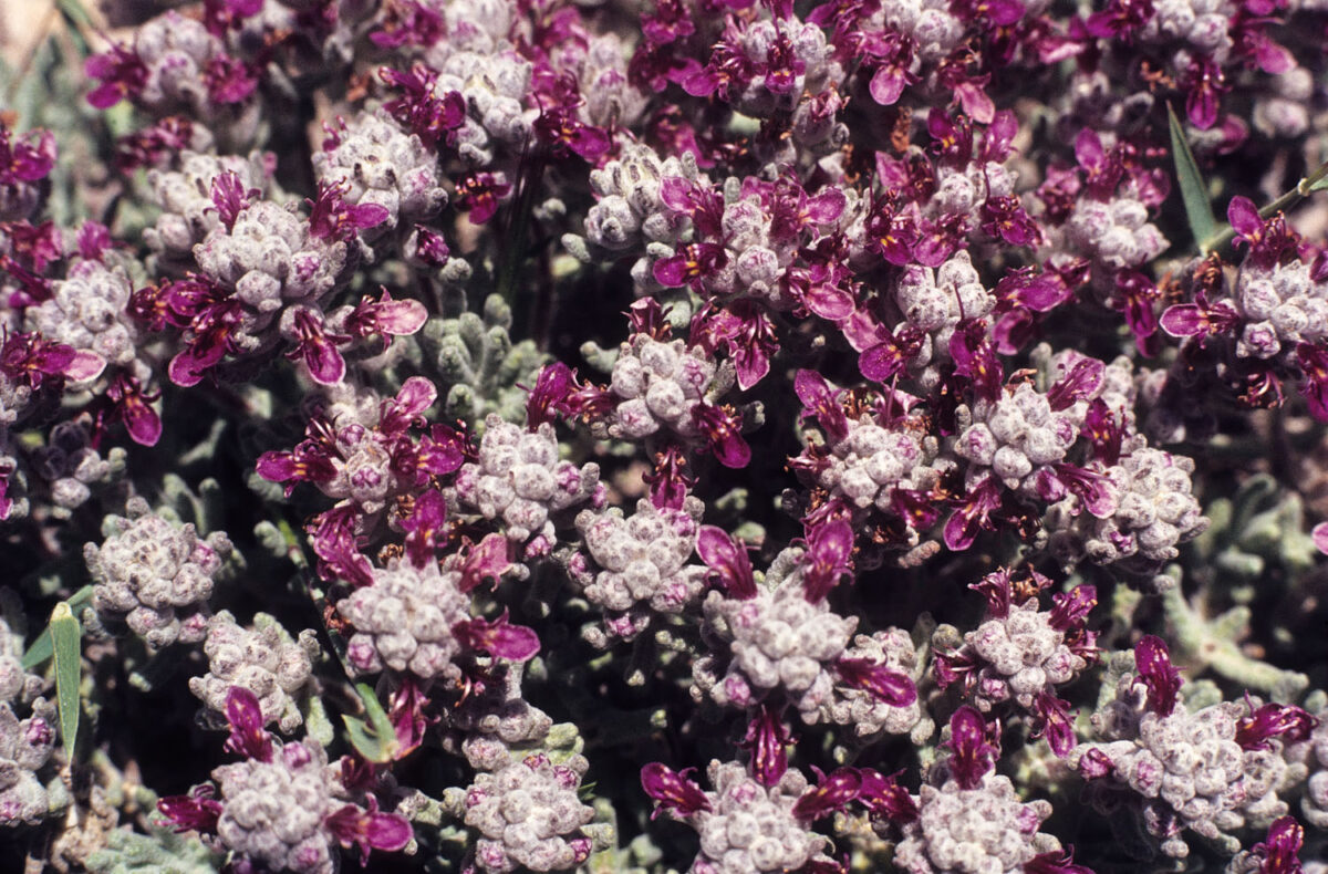 Mata densa, con tallos algodonoso–tomentosos, blanquecinos o grisáceos, los floríferos pubescentes, a veces verde–amarillentos (dimorfismo estacional). Hojas (4)8–10(14) x (1)2–3(4) mm, opuestas, fasciculadas, sésiles, triangular–agudas u oblongo–lanceoladas, cuneadas o cordadas, crenadas o lobuladas, tomentosas. Inflorescencia en cabezuela terminal o en pseudo–panícula de cabezuelas pedunculadas, paucifloras. Flores zigomorfas, hermafroditas o femeninas (ginodioecia), pentámeras. Cáliz 4,5–5,5(6) mm, voluminoso, algodonoso–tomentoso, tubular, algo giboso, con 5 dientes triangular–obtusos u ovados, 3 superiores con el central más ancho que alto y 2 inferiores agudos. Corola 8–8,5 mm, unilabiada, púrpura, rosácea o crema; lóbulos 5, los latero–posteriores ciliados. Núculas 1–2(3), reticuladas